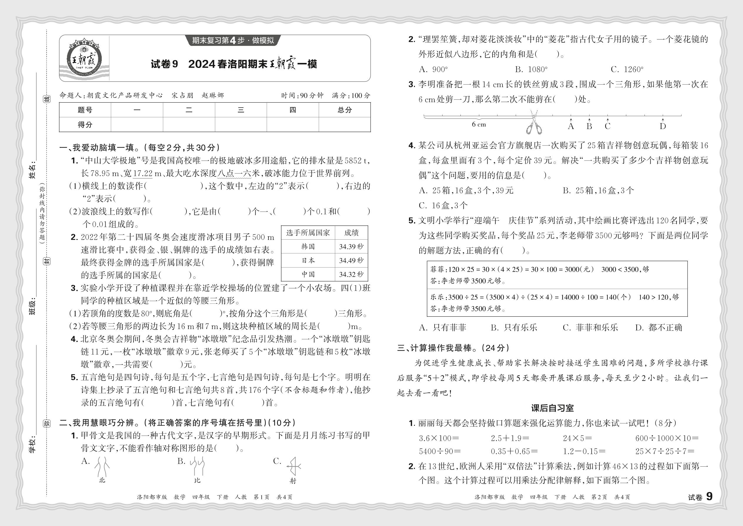 2024春下册四年级数学人教版 河南洛阳期末王朝霞一模