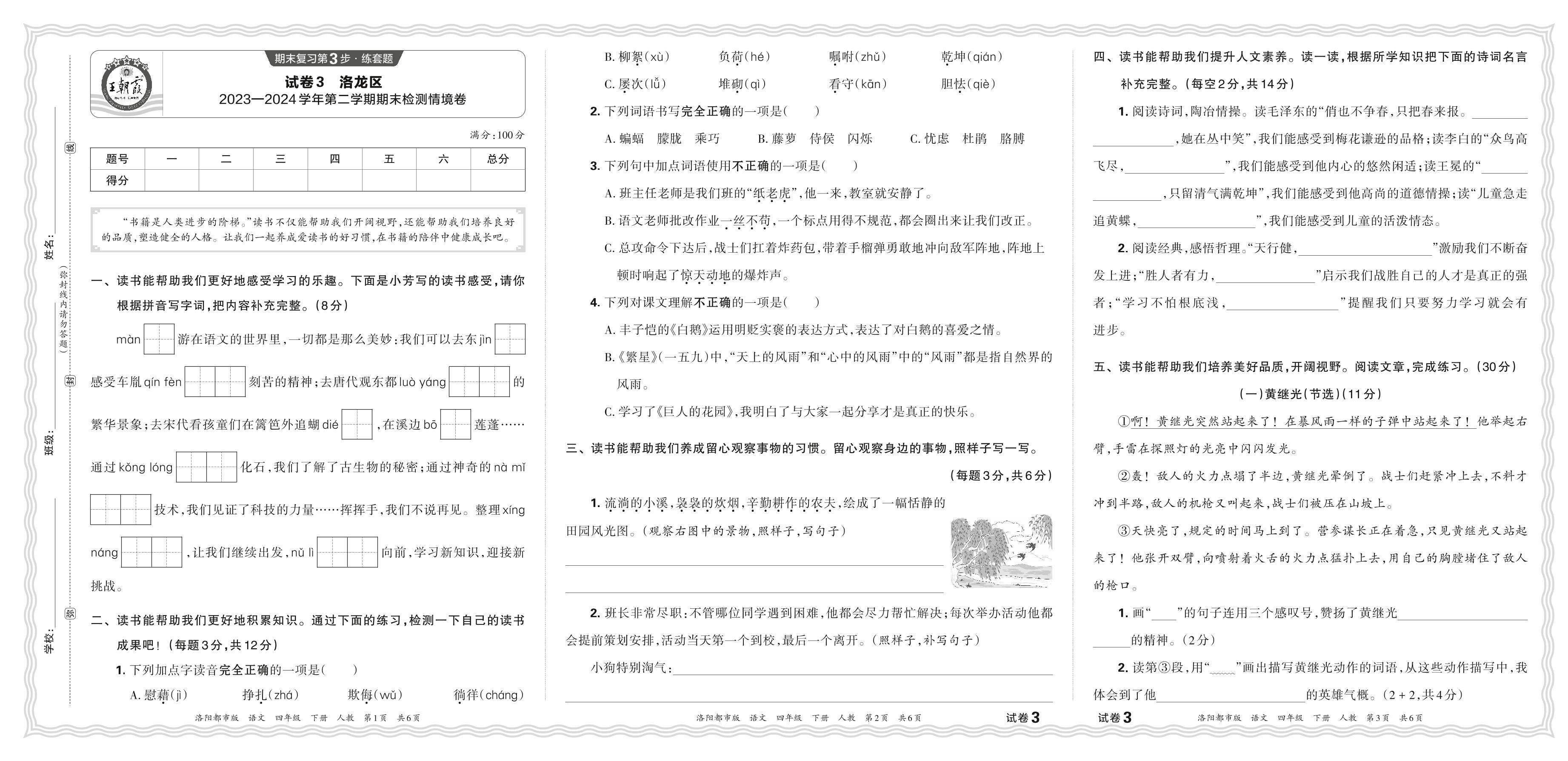 河南省洛阳市洛龙区2023—2024学年第二学期四年级语文期末检测情境卷(人教版)【3】