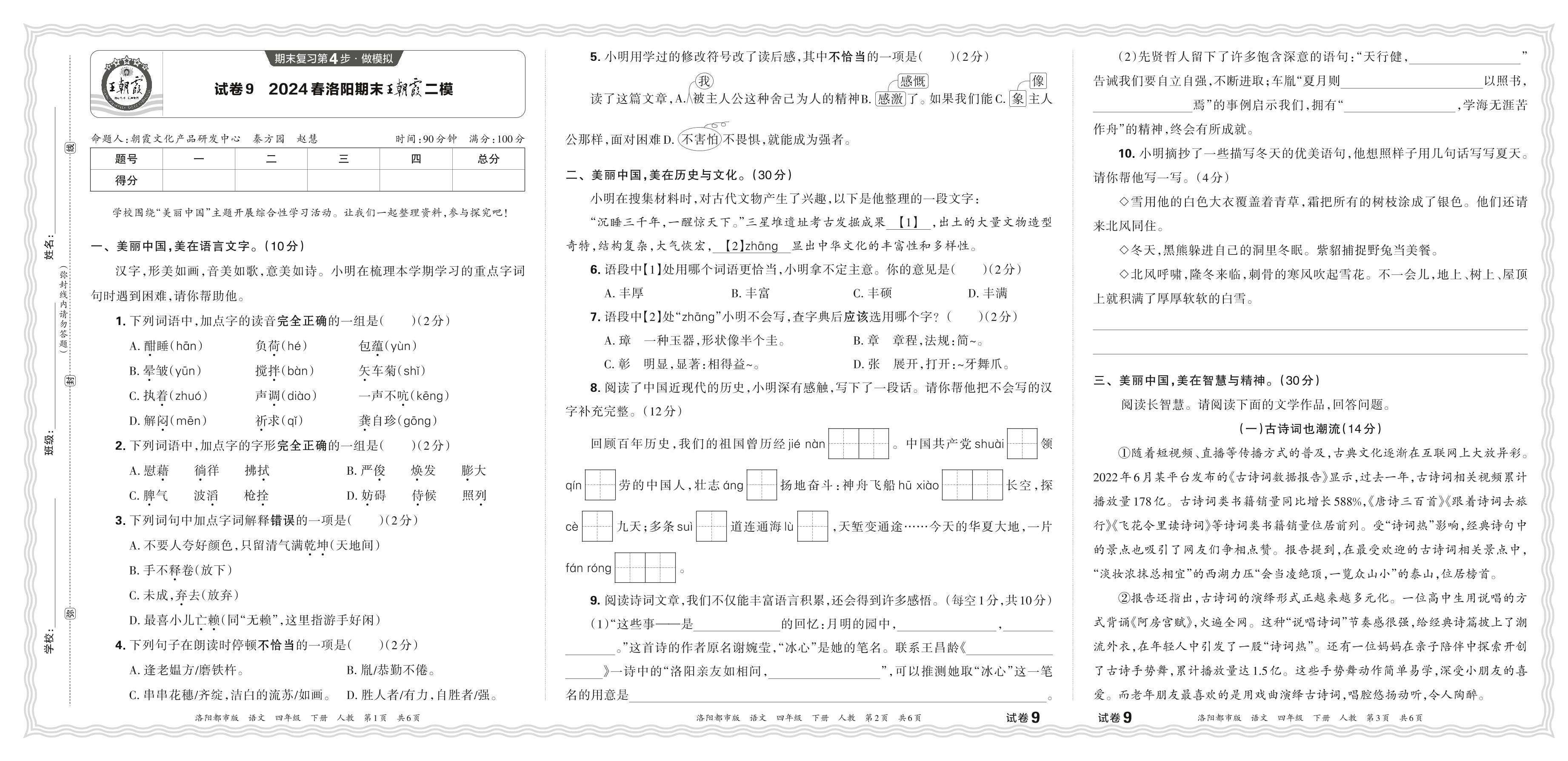 2024春下册四年级语文人教版 河南洛阳期末王朝霞二模