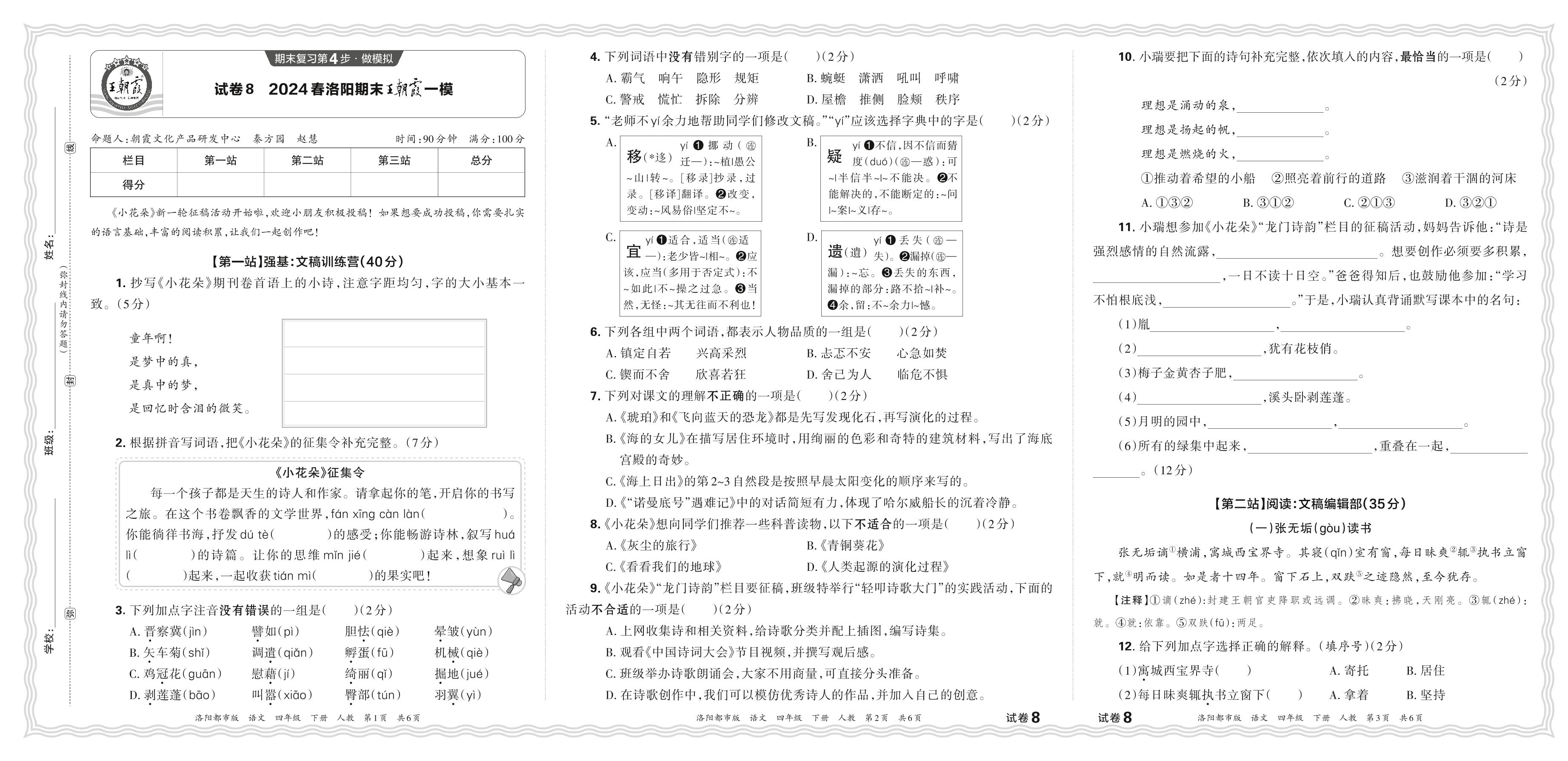 2024春下册四年级语文人教版 河南洛阳期末王朝霞一模