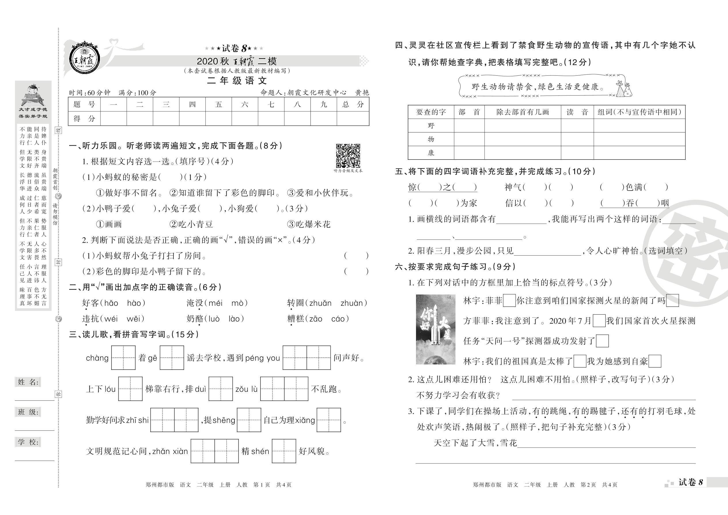 王朝霞期末模拟卷二年级上册语文(人教版)_R21080165542【8】