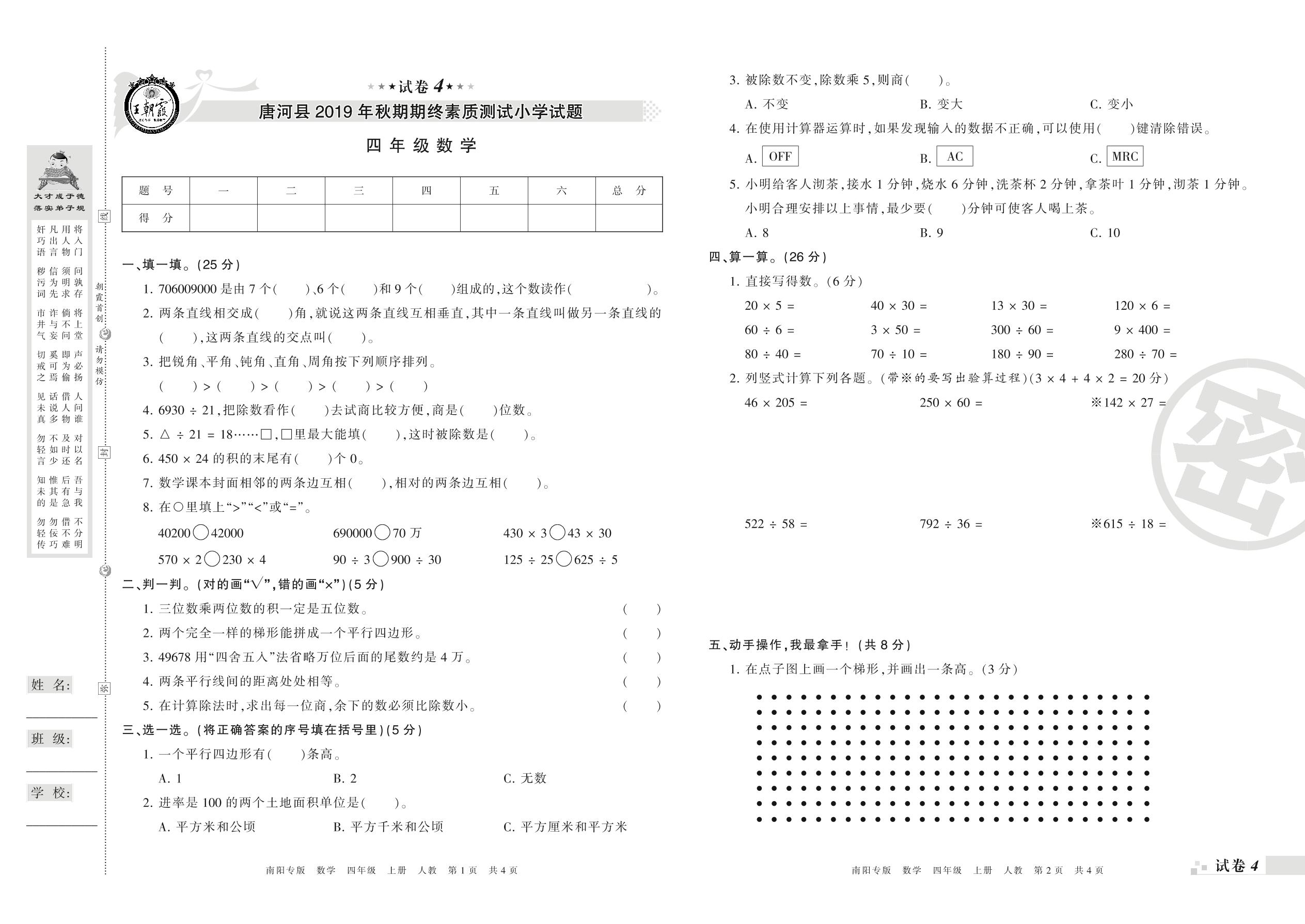 2019-2020学年第一学期南阳市唐河县四年级数学试卷(人教版)【4】