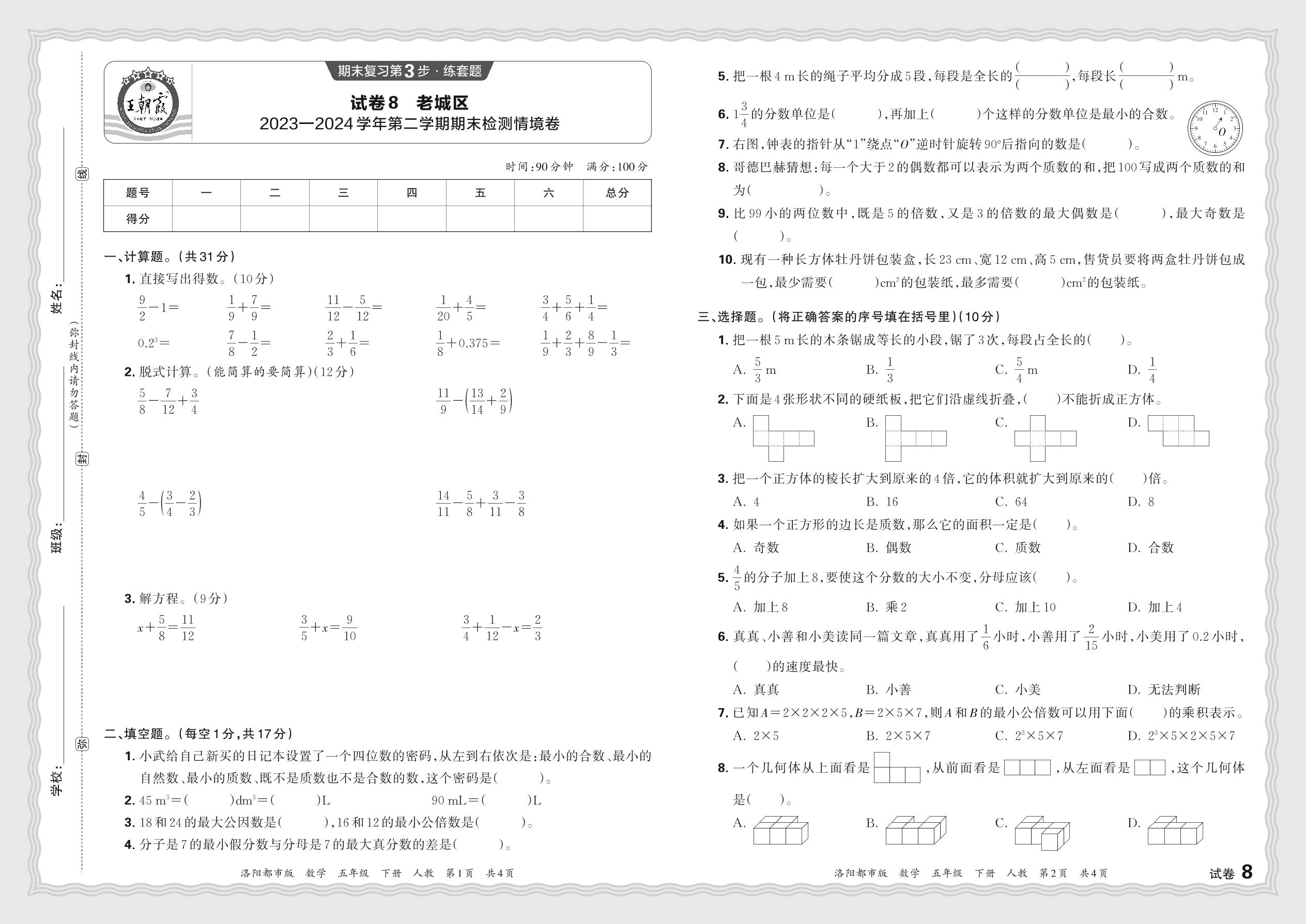 河南省洛阳市老城区2023—2024学年第二学期五年级数学期末检测情境卷(人教版)【8】