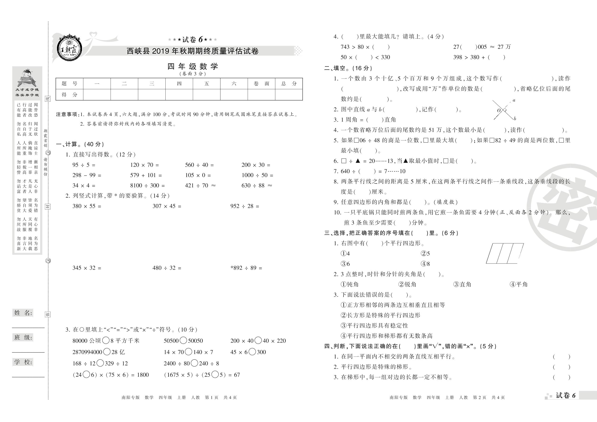2019-2020学年第一学期南阳市西峡县四年级数学试卷(人教版)【6】