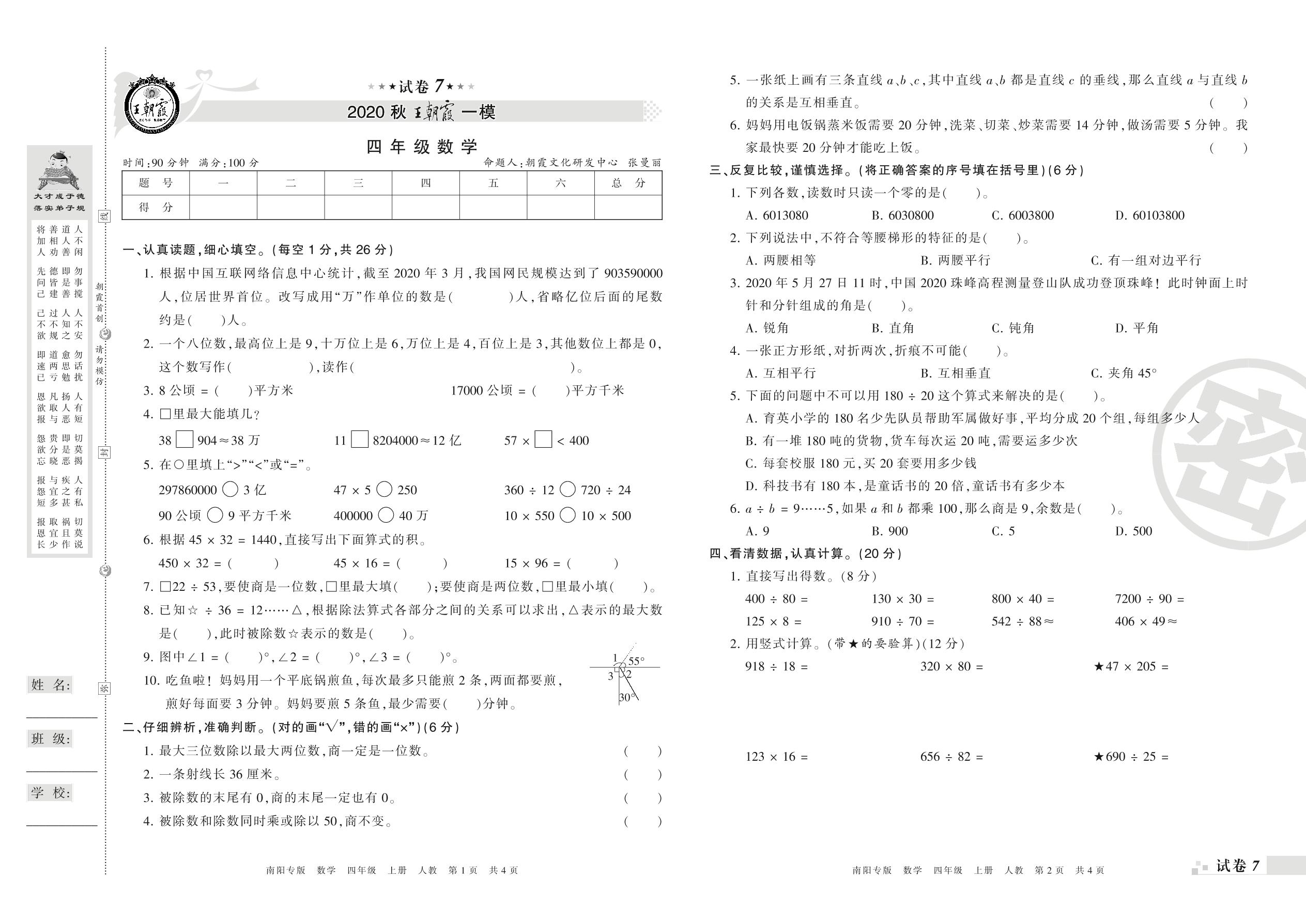 王朝霞期末模拟卷四年级上册数学(人教版)_R210804140609【7】