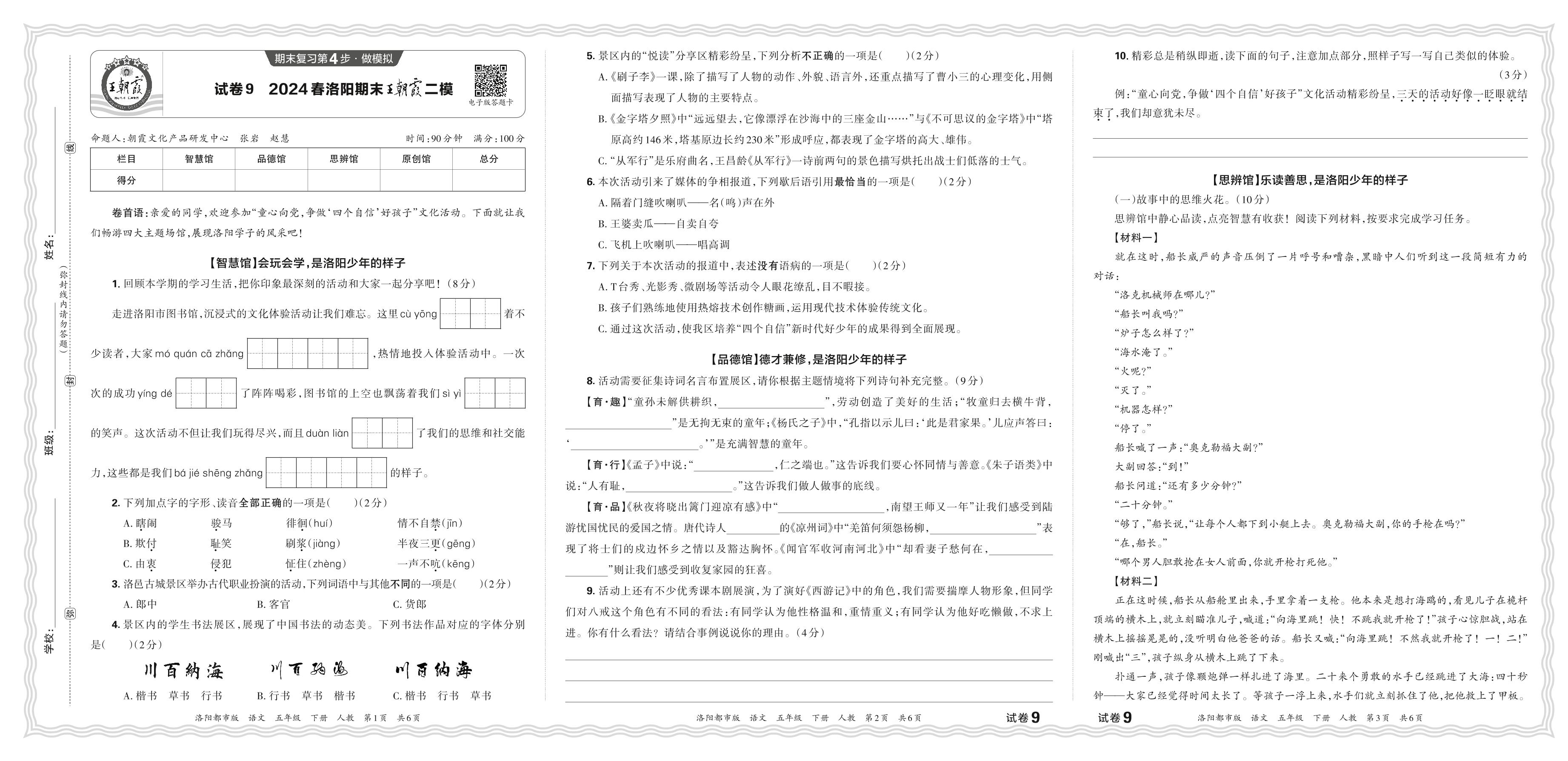 2024春下册五年级语文人教版 河南洛阳期末王朝霞二模