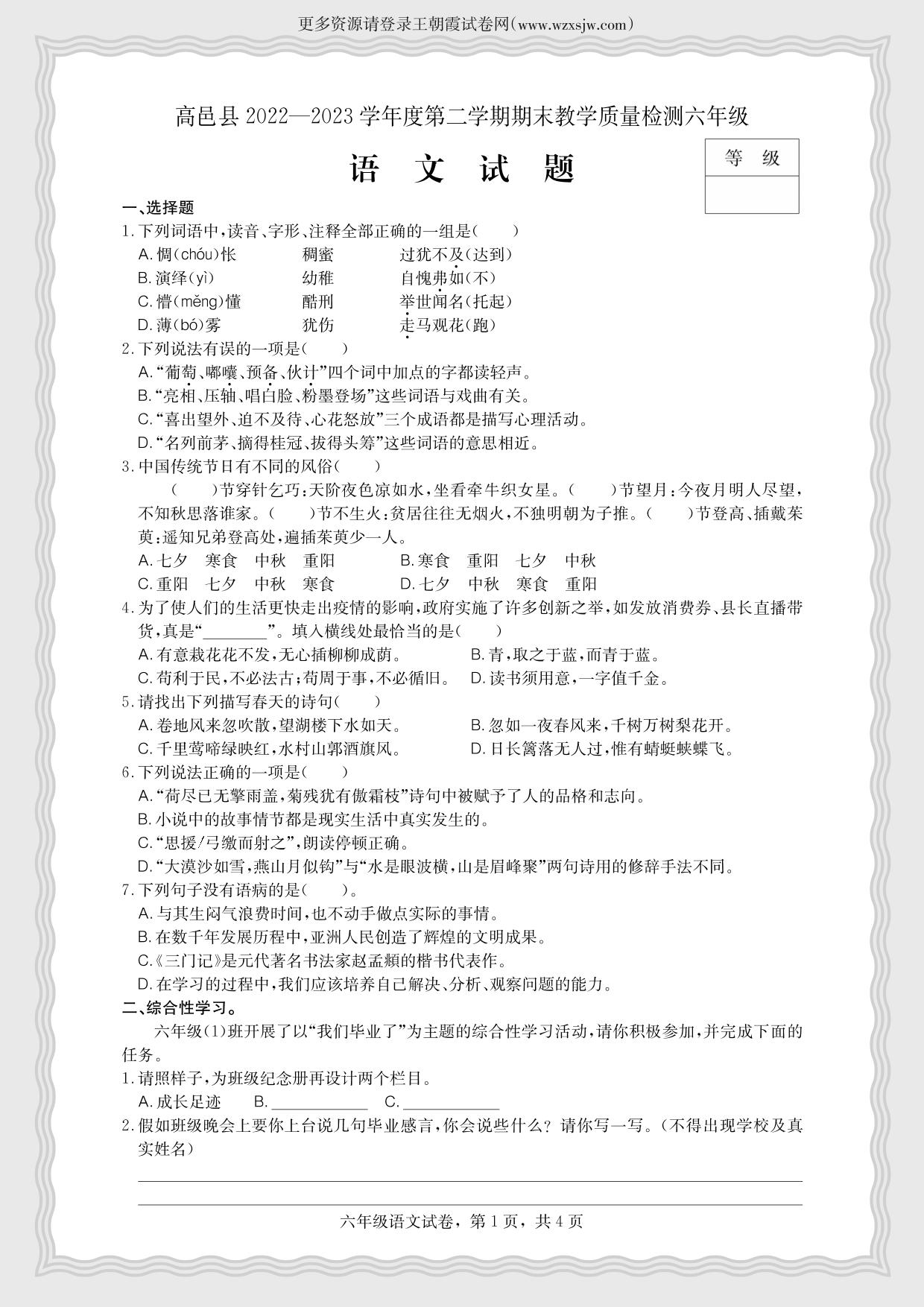 河北省石家庄市高邑县2022-2023学年度第二学期期末教学质量检测试题六年级语文(人教版)
