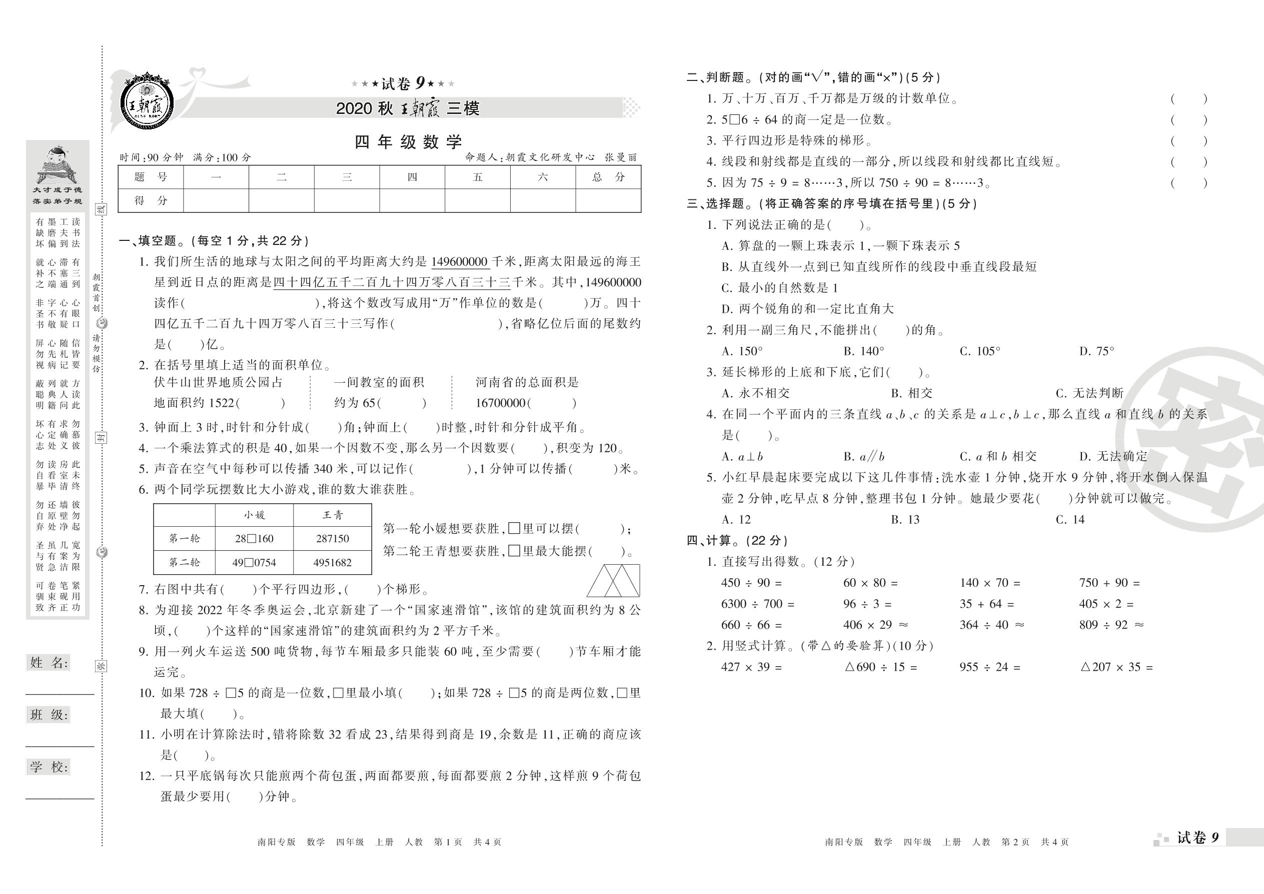 王朝霞期末模拟卷四年级上册数学(人教版)_R210804140619【9】