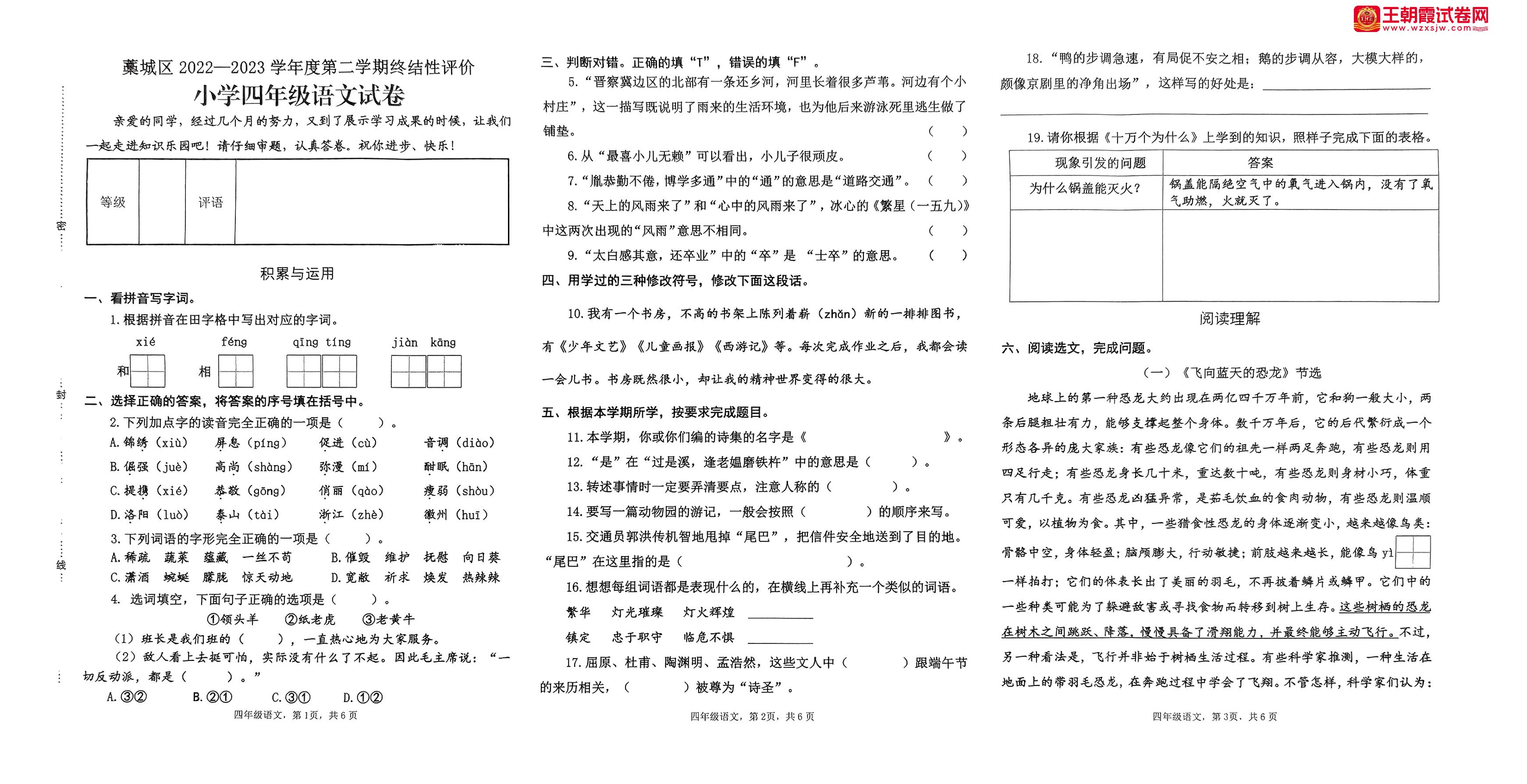 河北省石家庄市藁城区2022-2023学年度第二学期终结性评价试卷四年级语文(人教版)