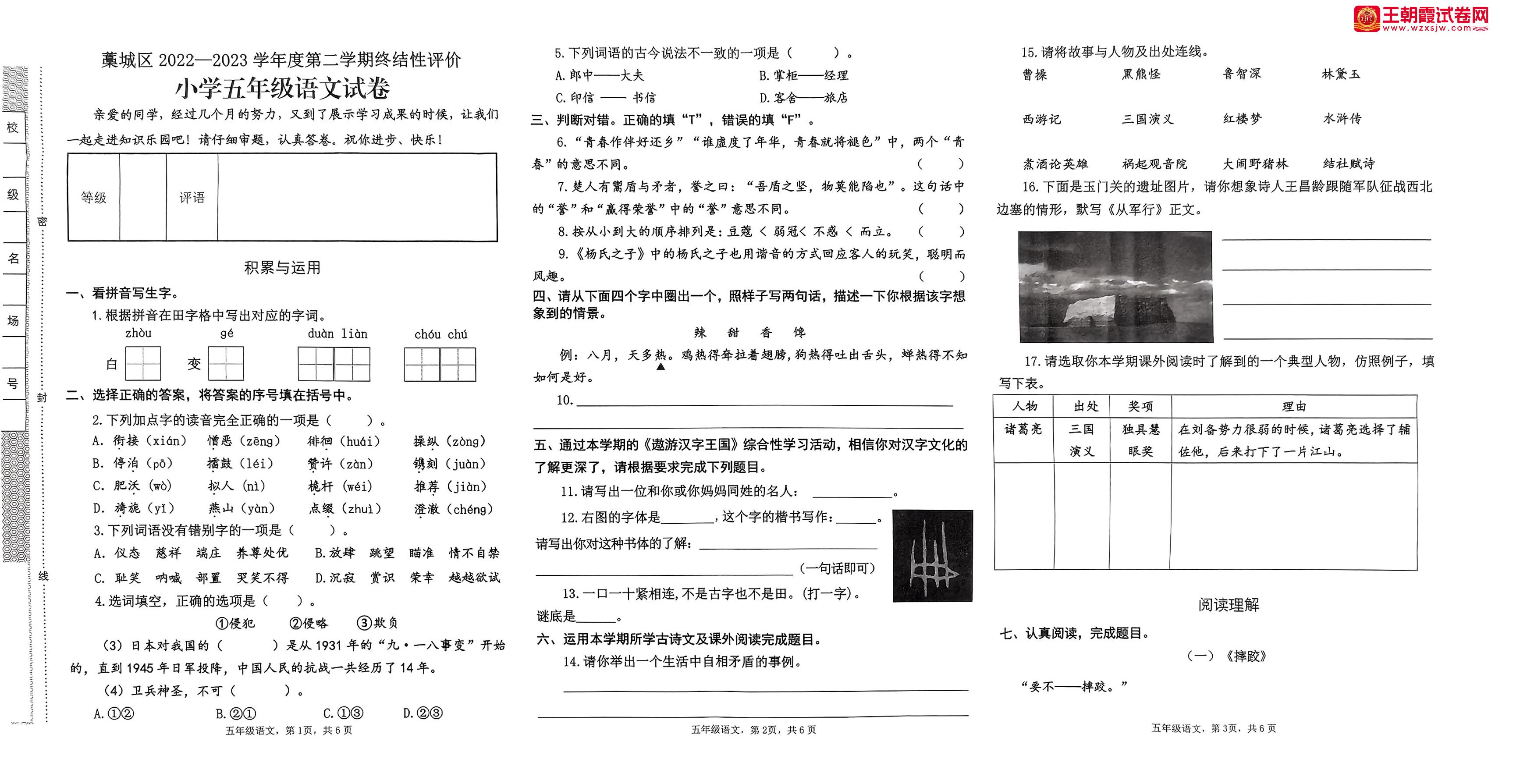 河北省石家庄市藁城区2022-2023学年度第二学期终结性评价试卷五年级语文(人教版)