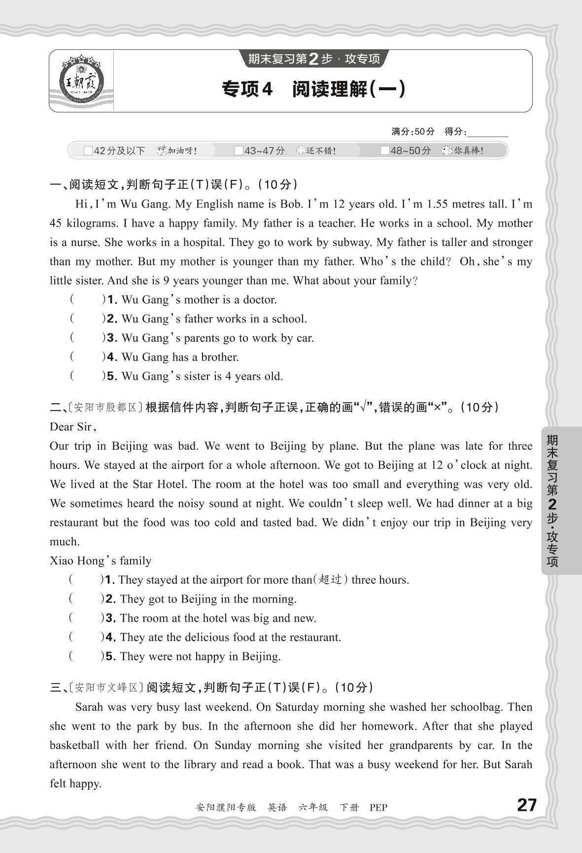 2024春下册六年级英语人教PEP版 期末专项卷安阳濮阳版·阅读理解(一)【4】