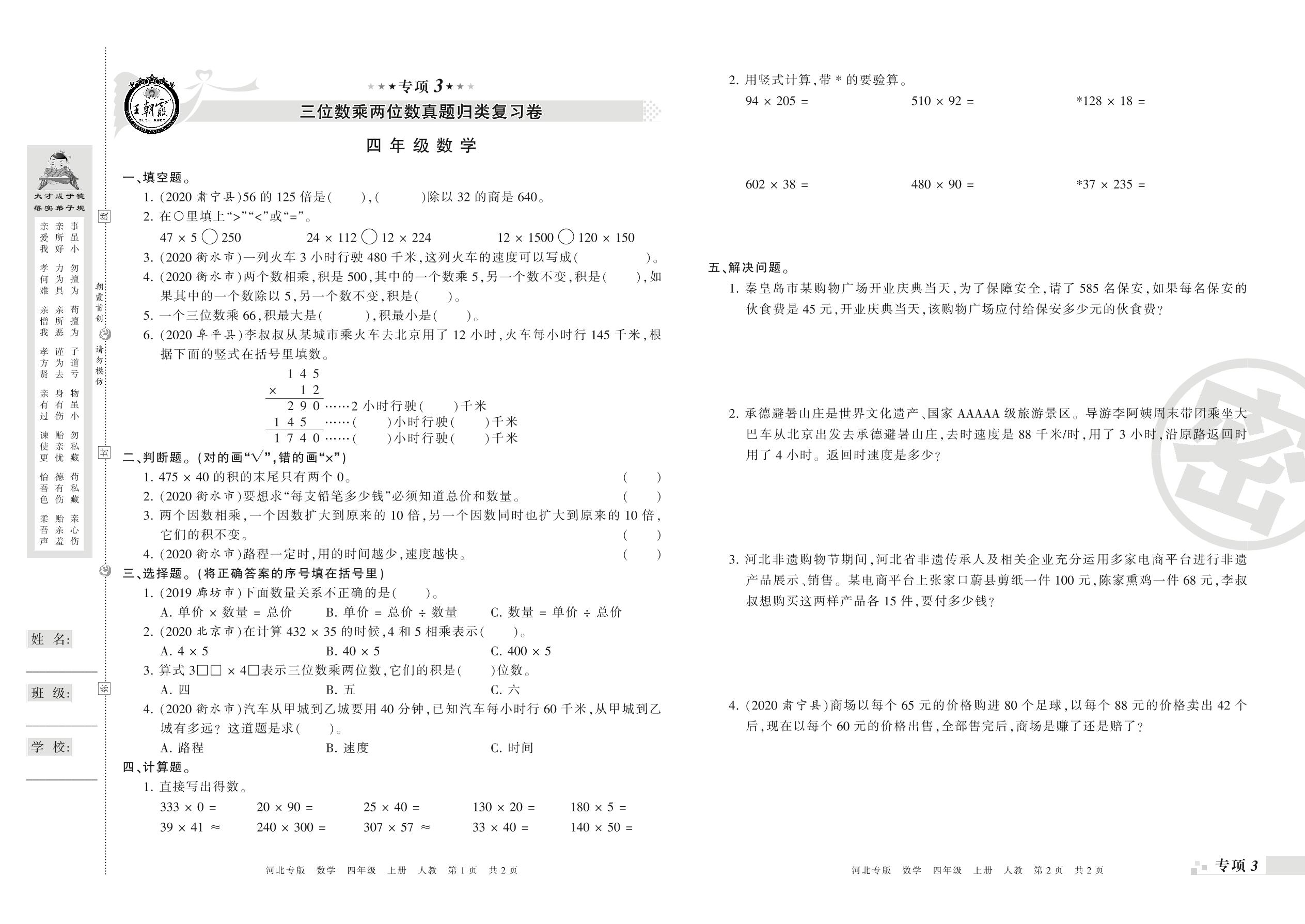 四年级数学人教版上册专项卷