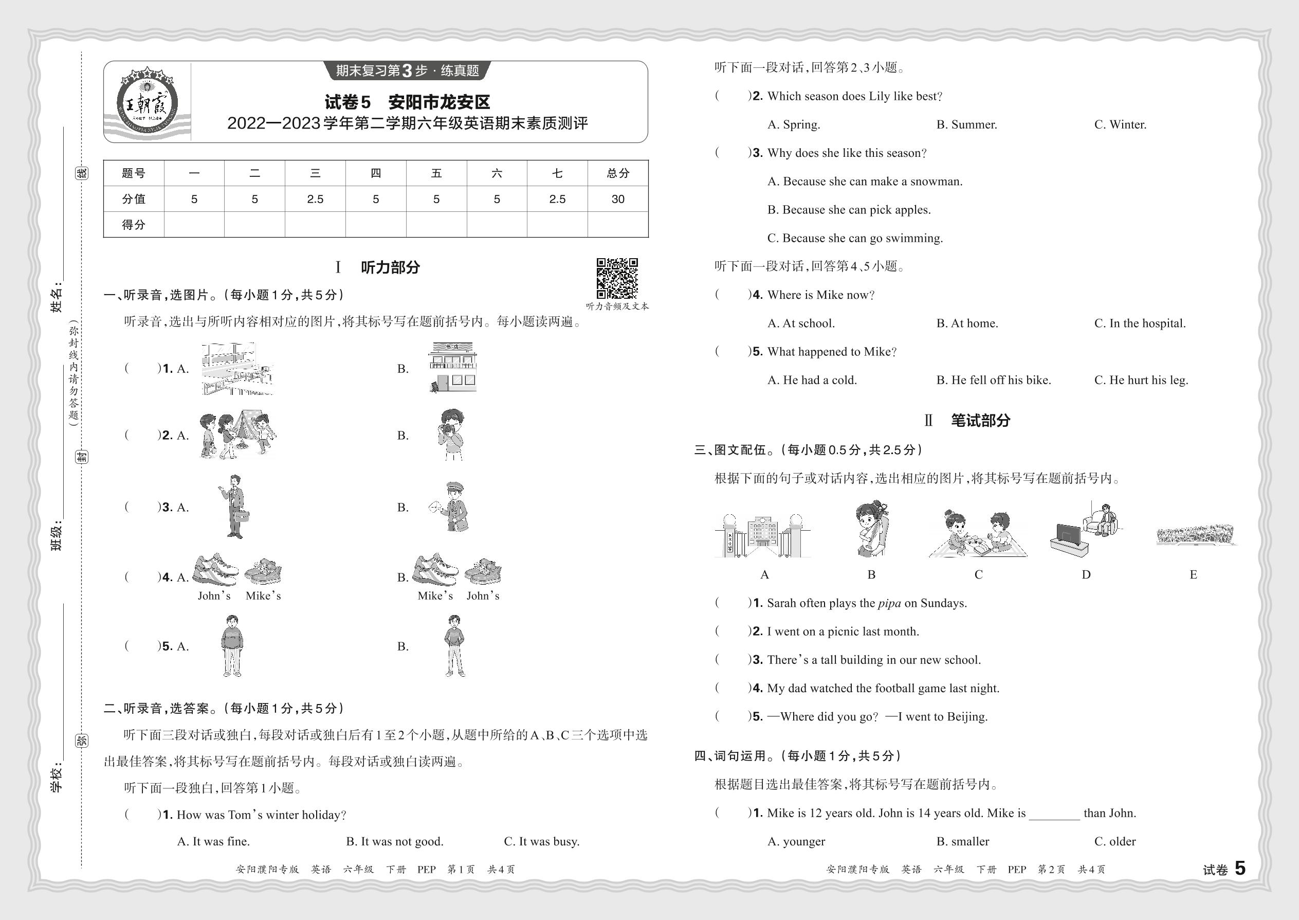 河南省安阳市龙安区2022-2023学年第二学期六年级英语期末素质测评(人教PEP版)【5】