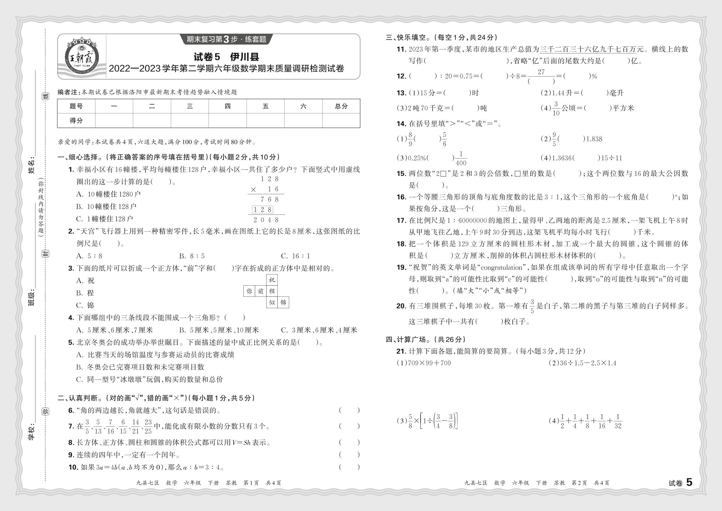 河南省洛阳市伊川县2023—2024学年第二学期六年级数学期末质量道调研检测试卷(苏教版)【5】