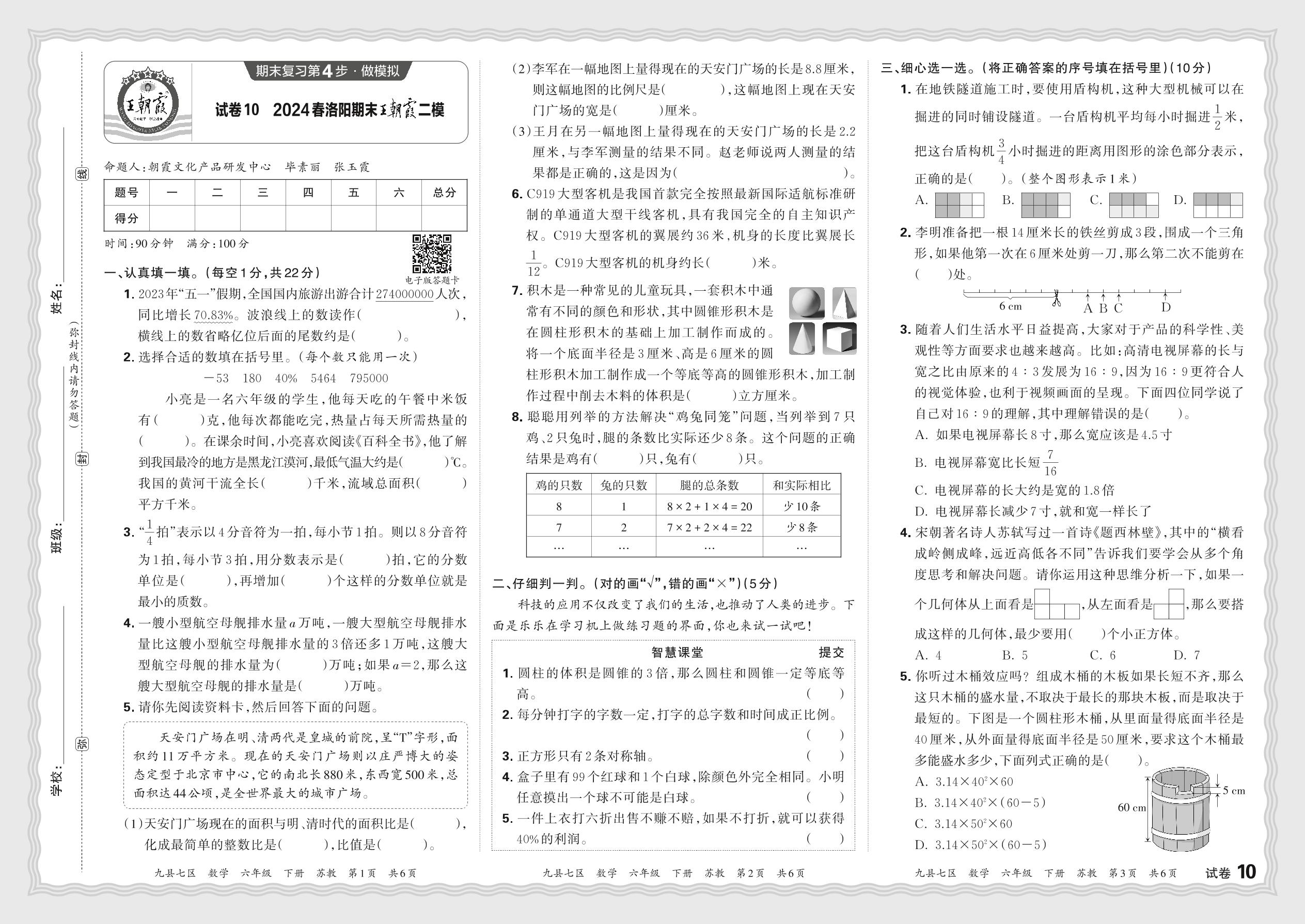 2024春下册六年级数学苏教版 河南洛阳期末王朝霞二模