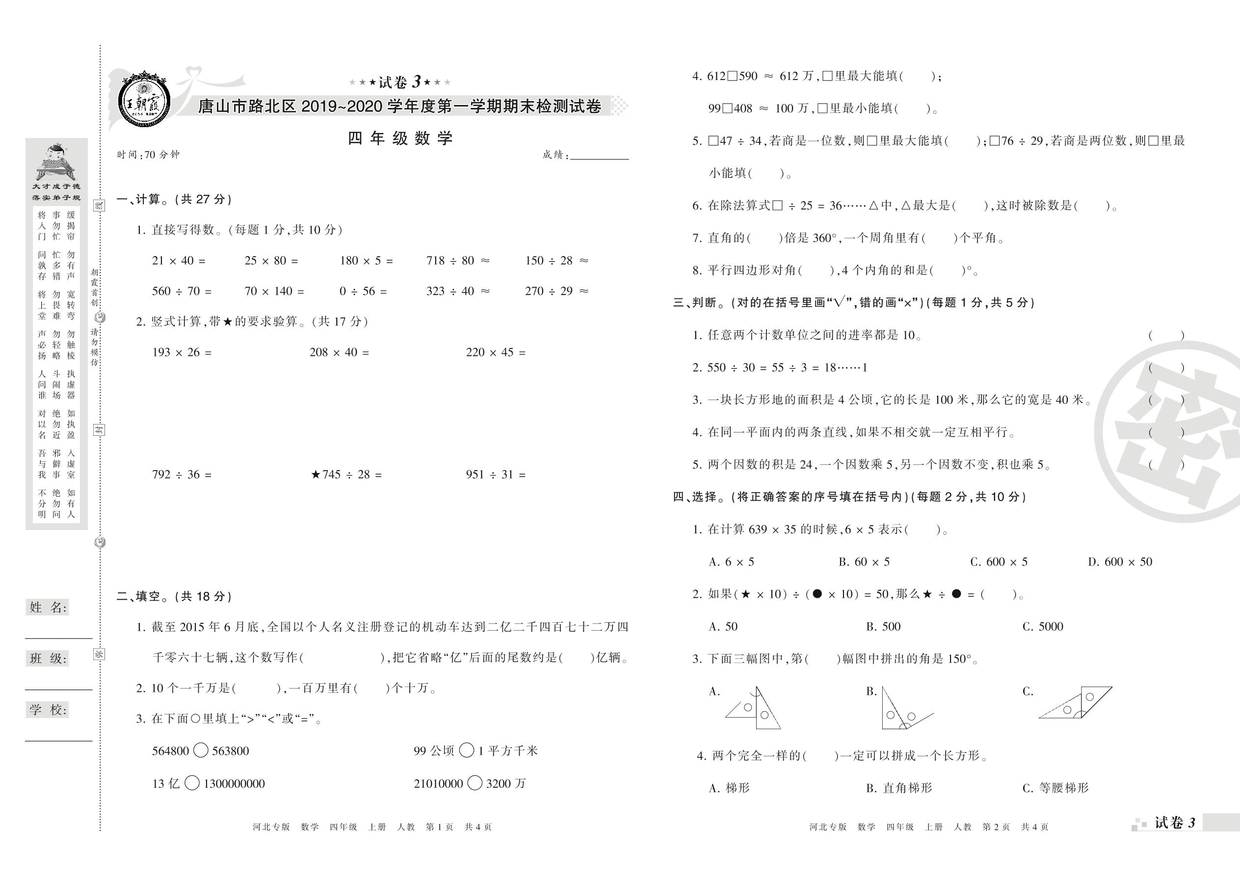 2019-2020学年第一学期唐山市路北区四年级数学试卷(人教版)【3】