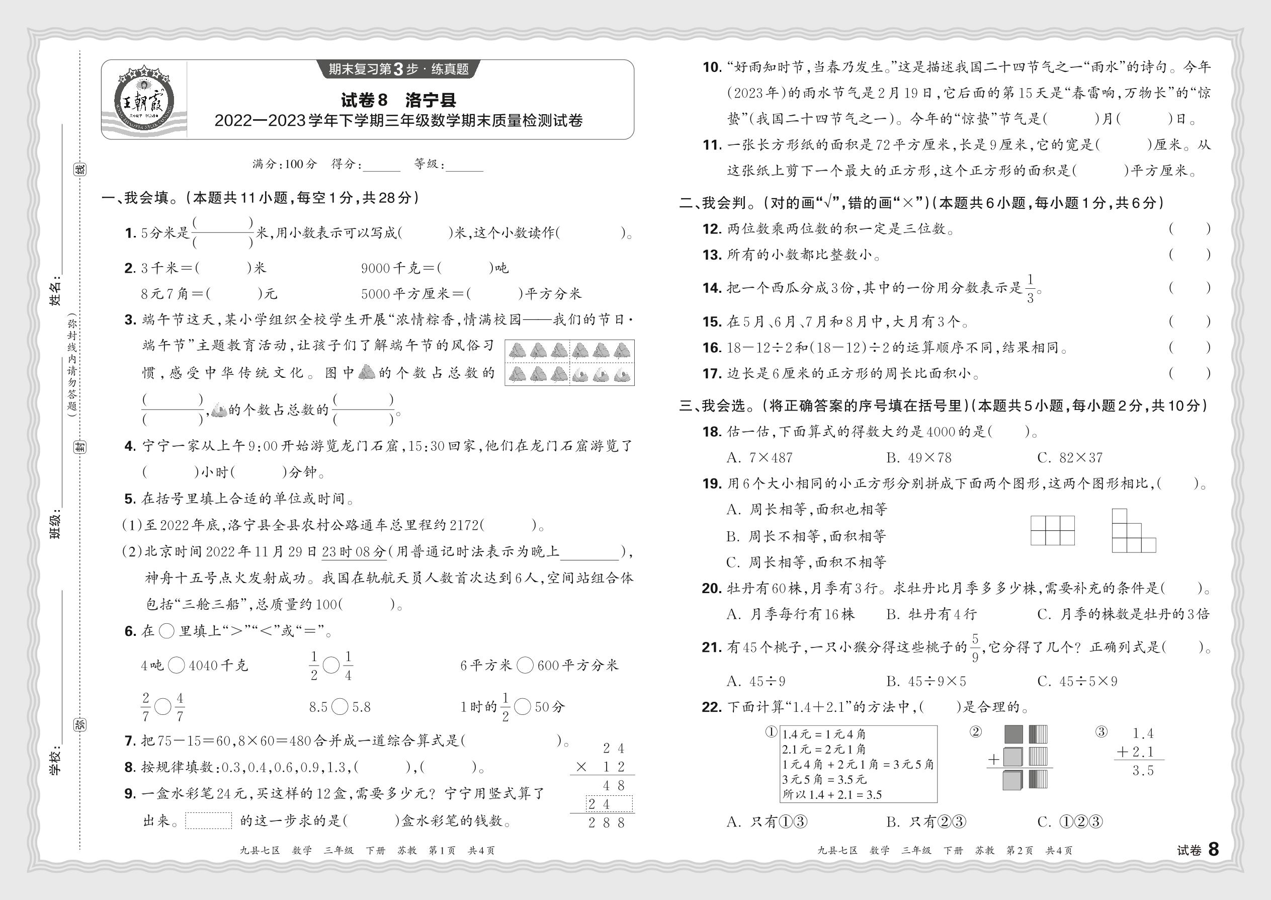 河南省洛阳市洛宁县2022—2023学年下学期三年级数学期末质量检测试卷(苏教版)【8】