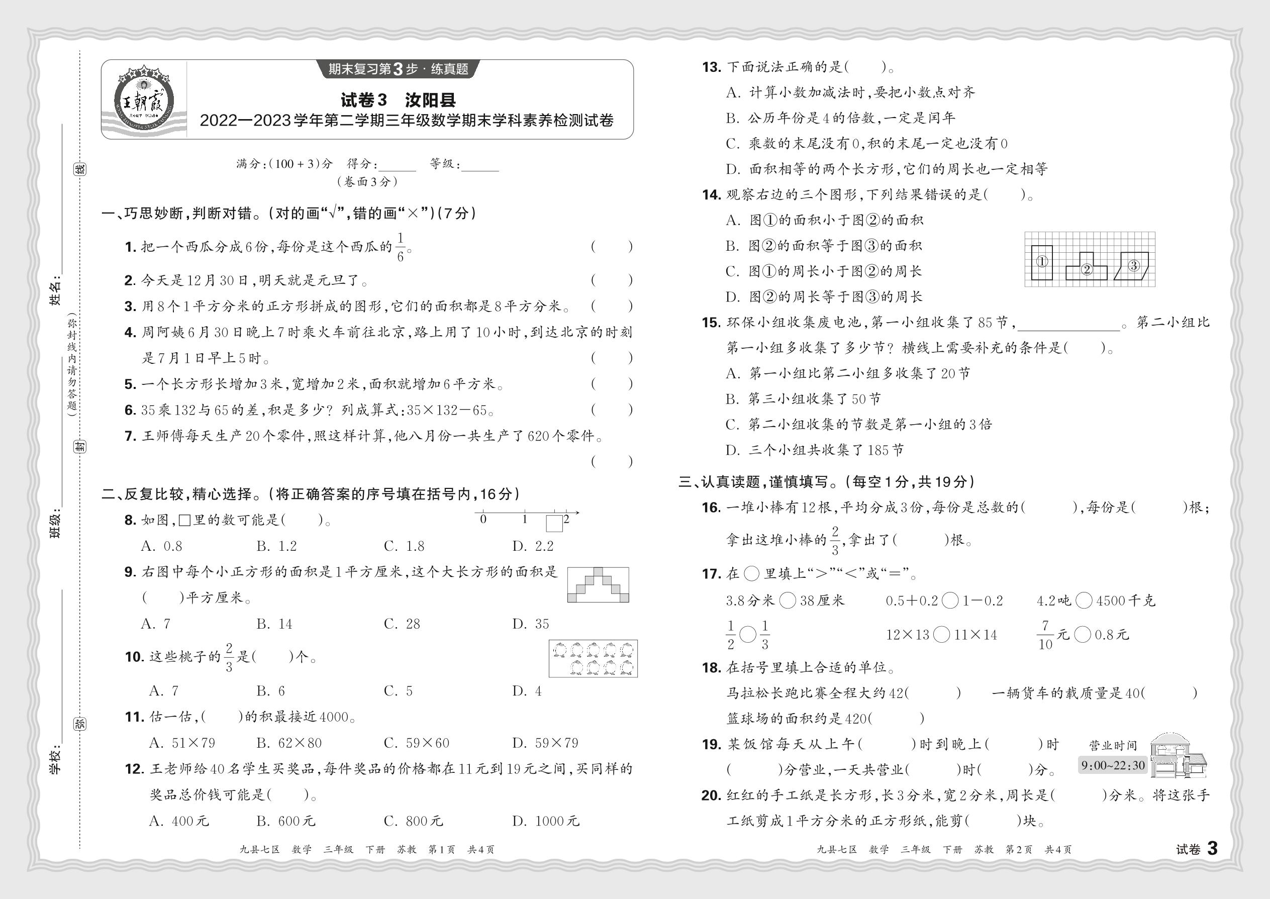 河南省洛阳市汝阳县2022—2023学年第二学期三年级数学期末学科素养检测试卷(苏教版)【3】