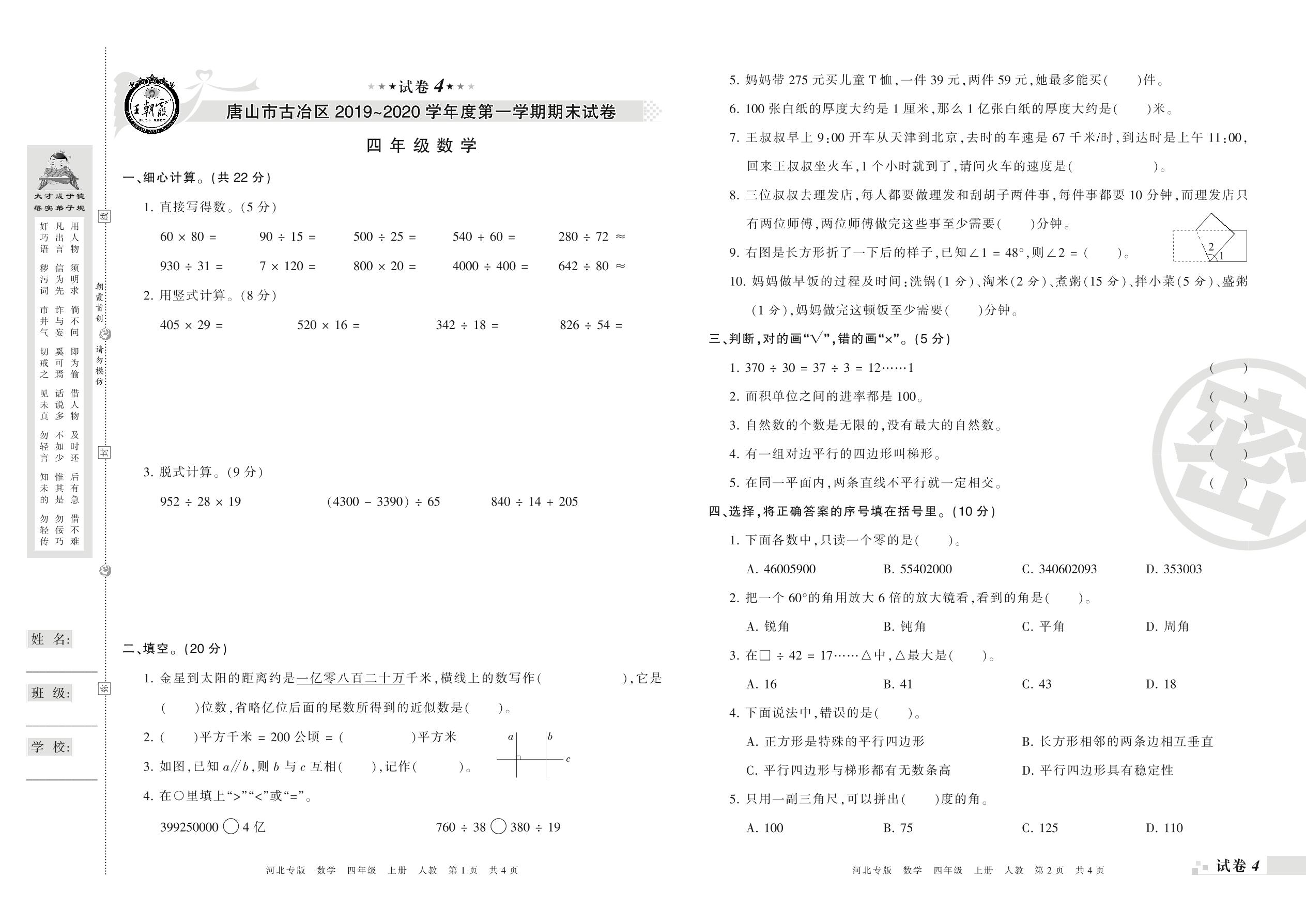 2019-2020学年第一学期唐山市古冶区四年级数学试卷(人教版)【4】