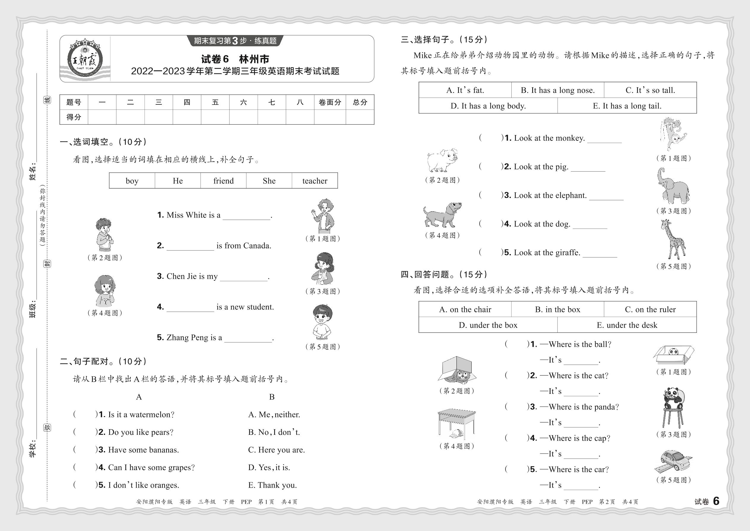 河南省安阳市林州市2022-2023学年第二学期三年级英语期末考试试题(人教PEP版)【6】