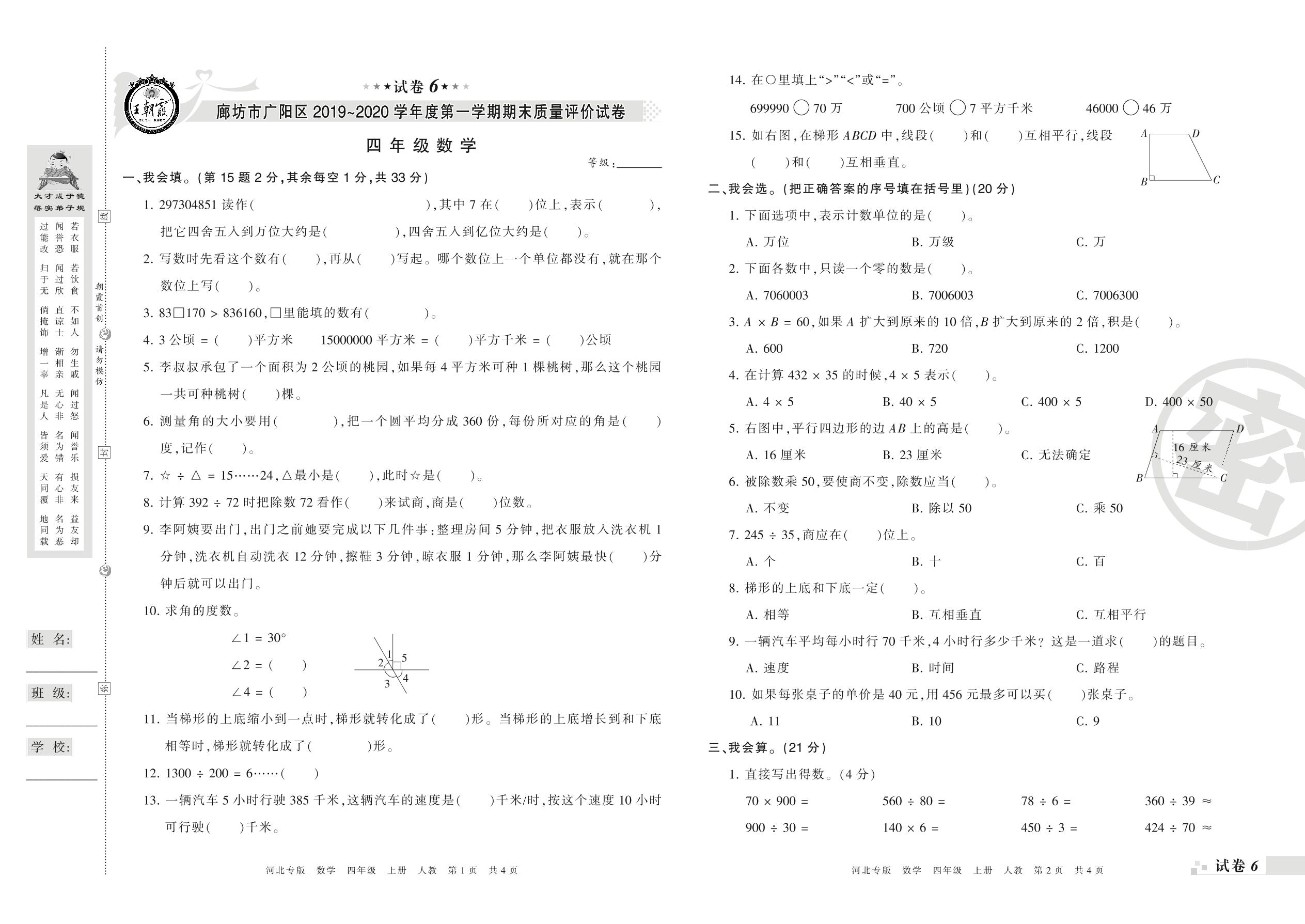 2019-2020学年第一学期廊坊市广阳区四年级数学试卷(人教版)【6】