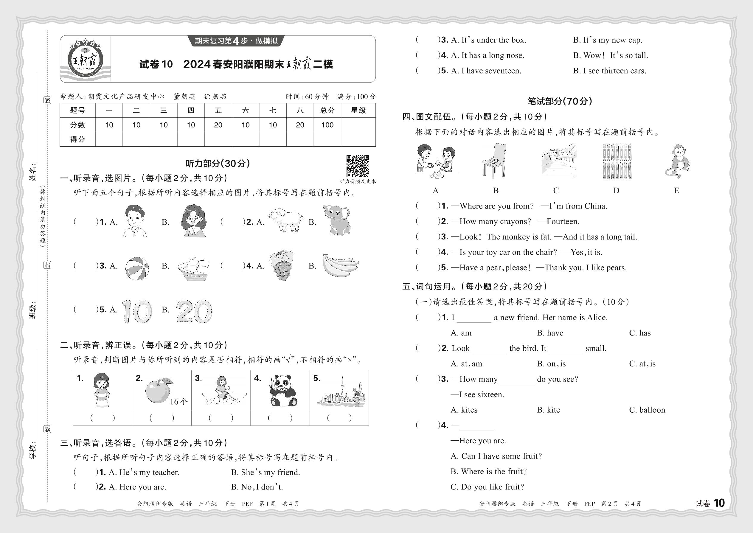 2024春下册三年级英语人教PEP版 河南安阳濮阳期末王朝霞二模【10】