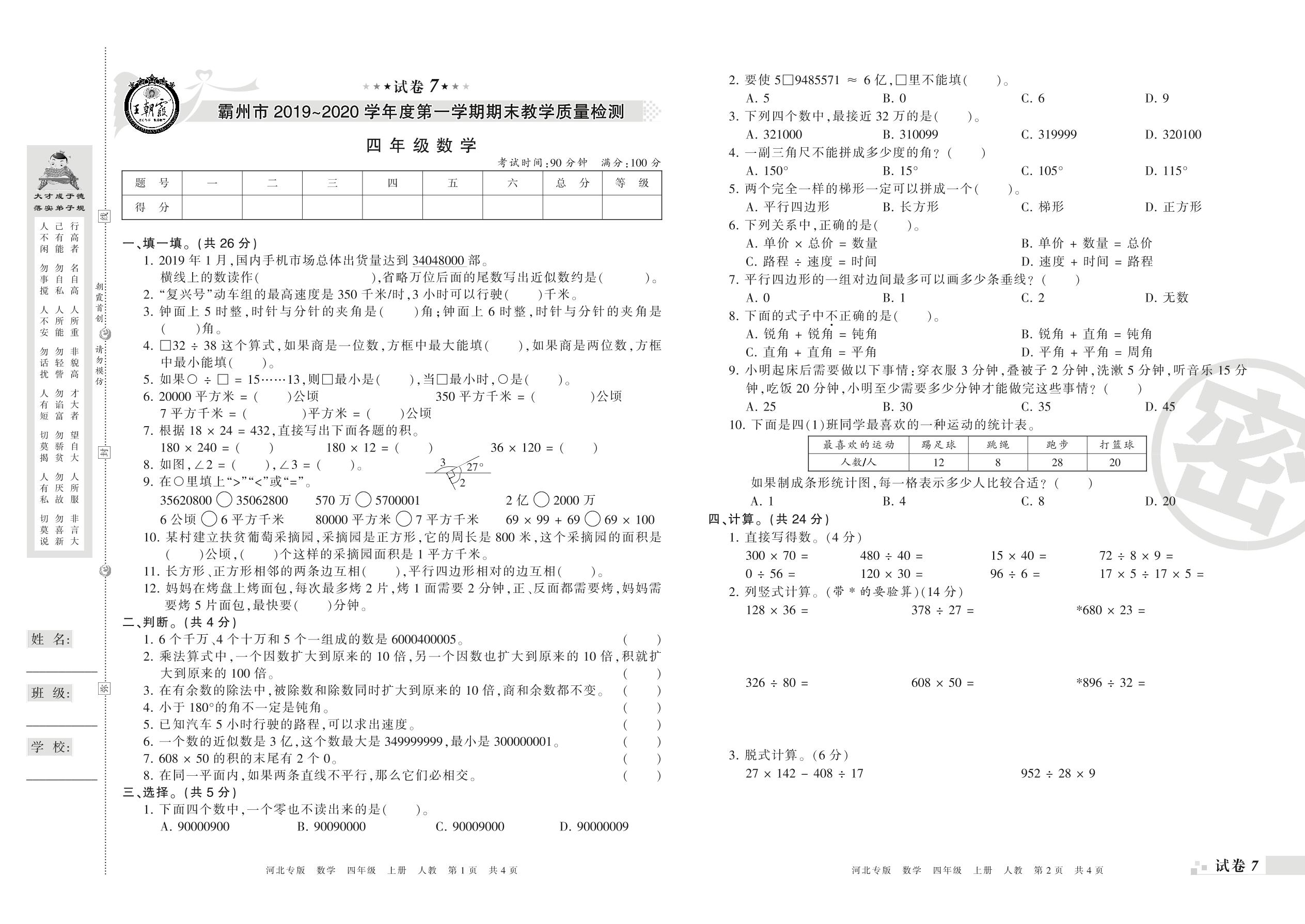 2019-2020学年第一学期霸州市四年级数学试卷(人教版)【7】