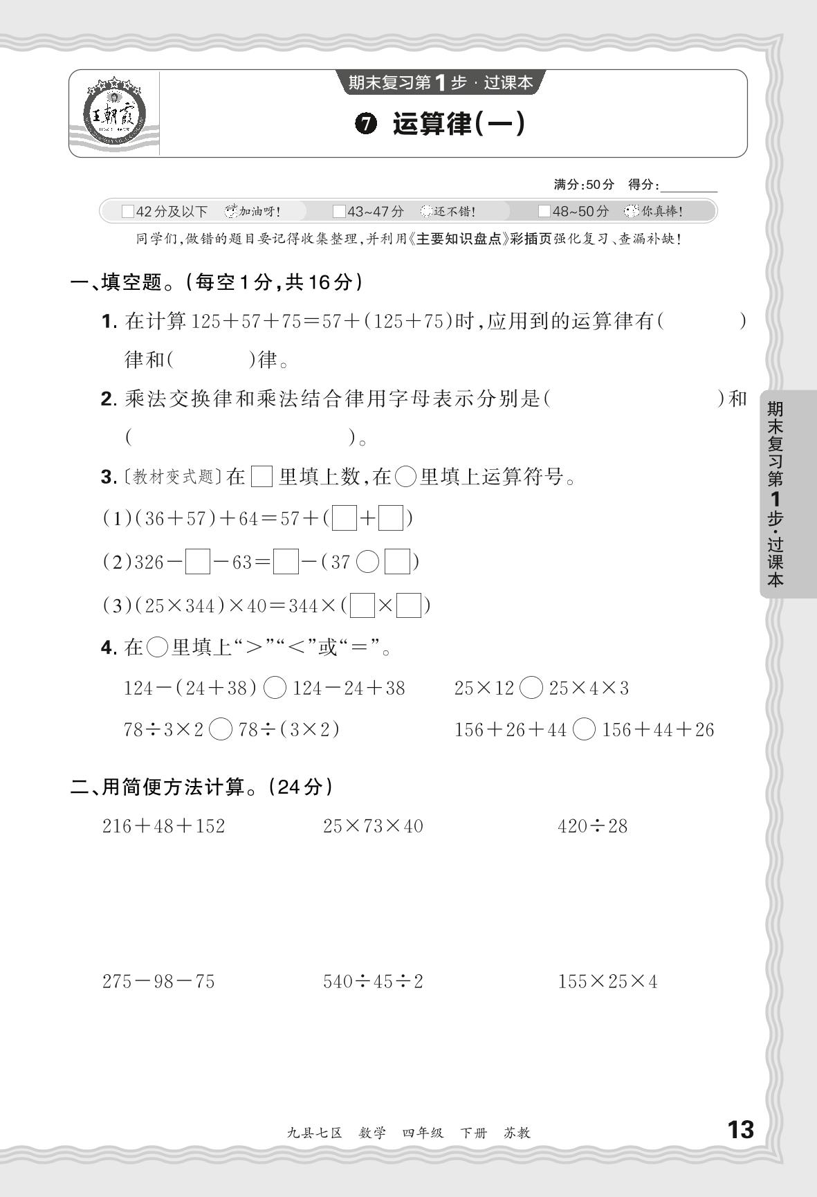 2024春下册四年级数学苏教版 期末过课本洛阳版·运算律(一)【7】