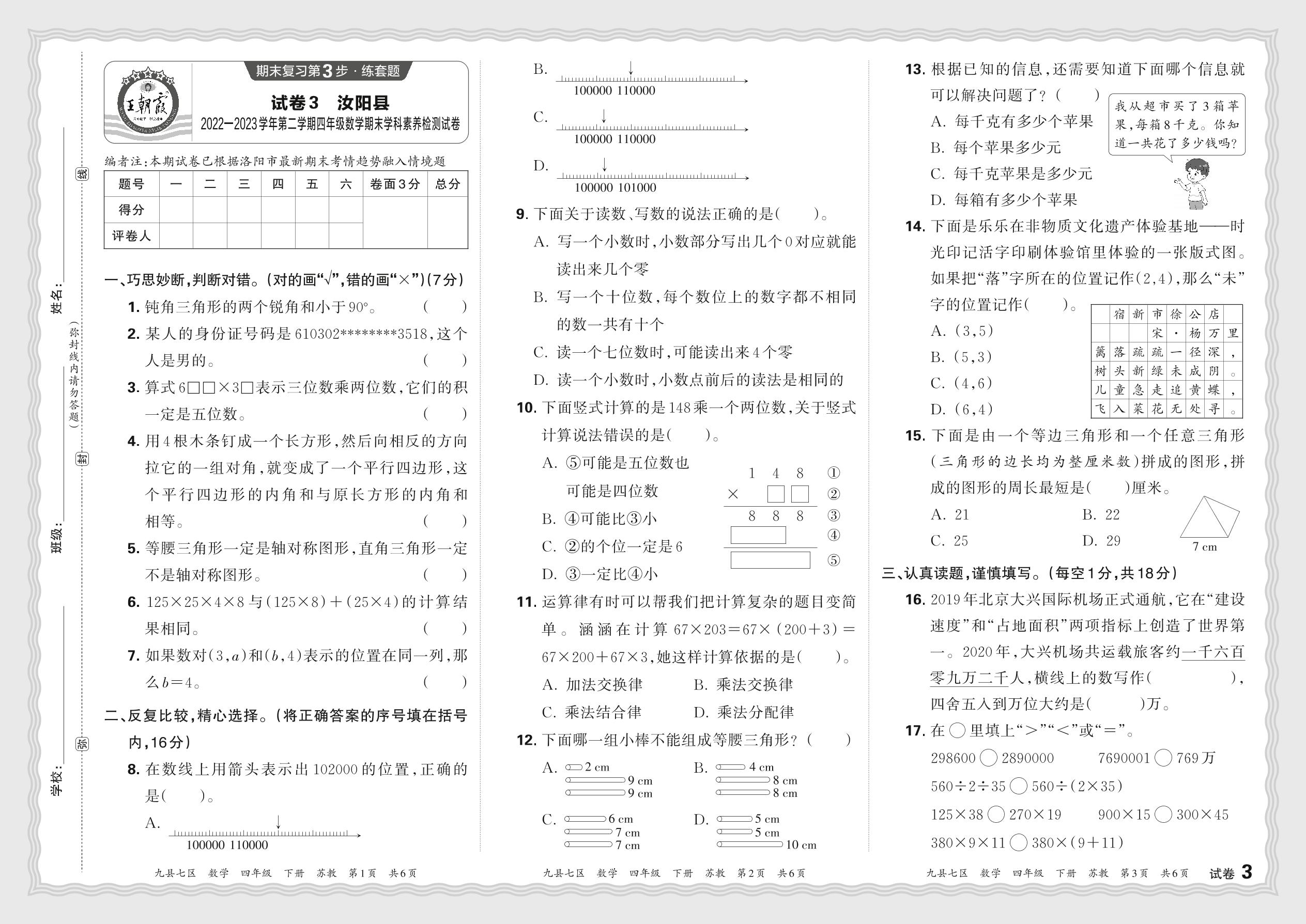 河南省洛阳市汝阳县2022—2023学年第二学期四年级数学期末学科素养检测试卷(苏教版)【3】