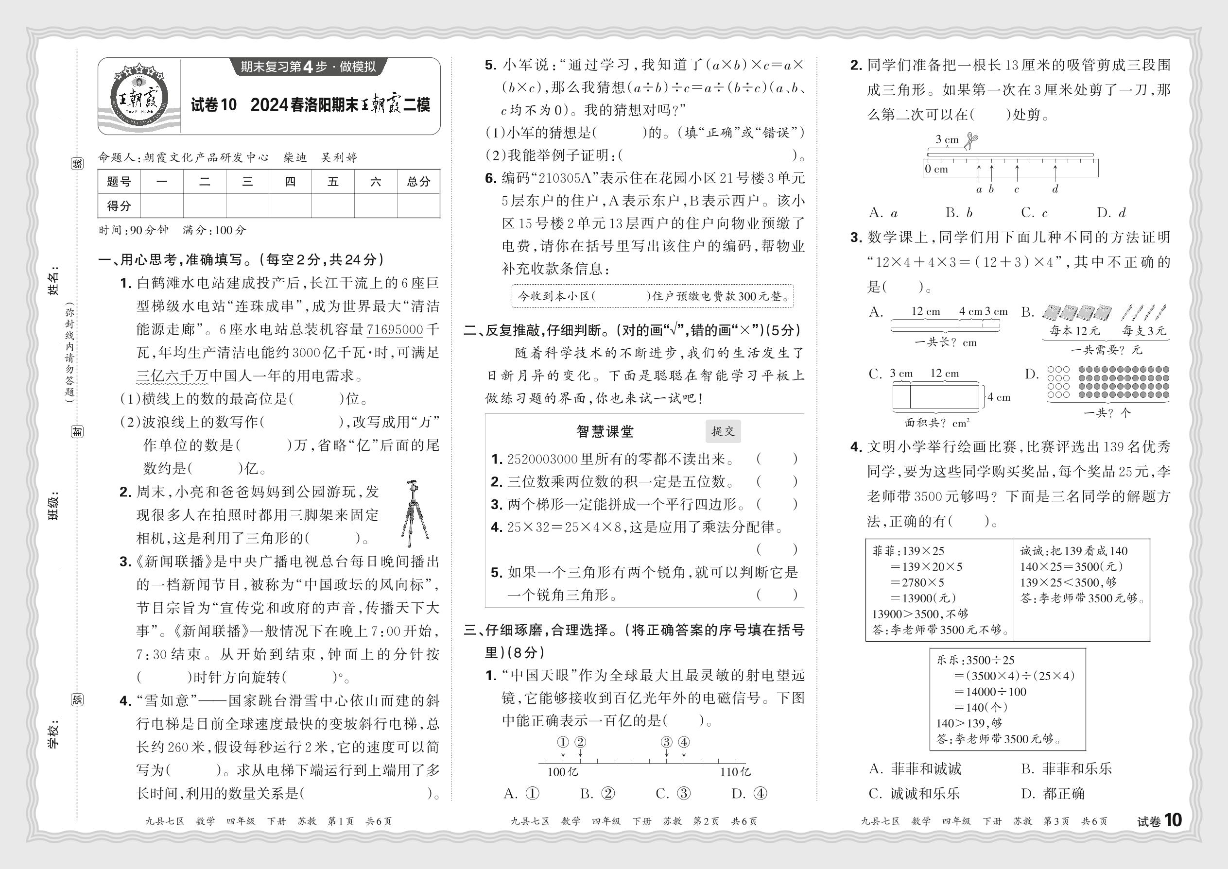 2024春下册四年级数学苏教版 河南洛阳期末王朝霞二模
