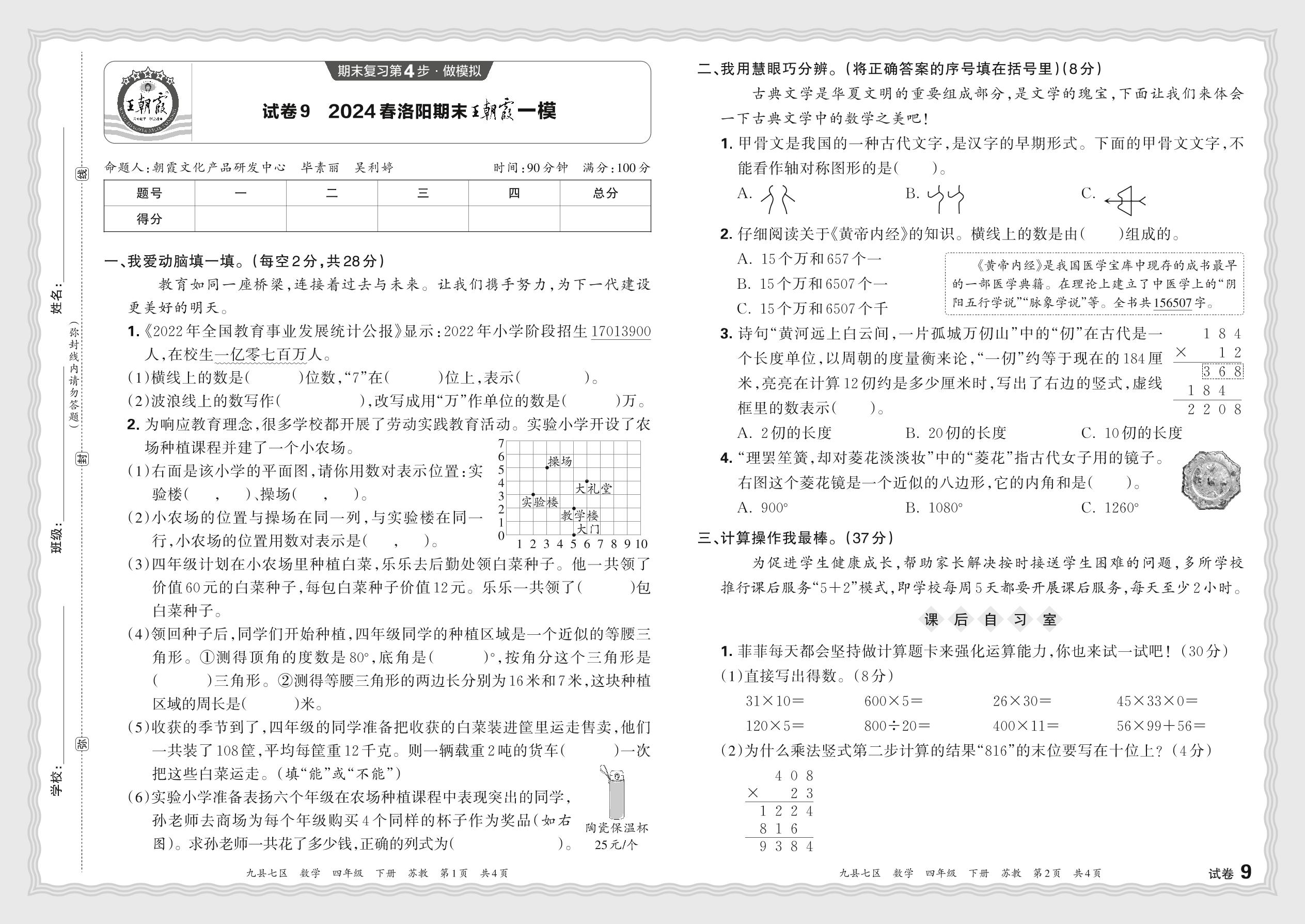 2024春下册四年级数学苏教版 河南洛阳期末王朝霞一模