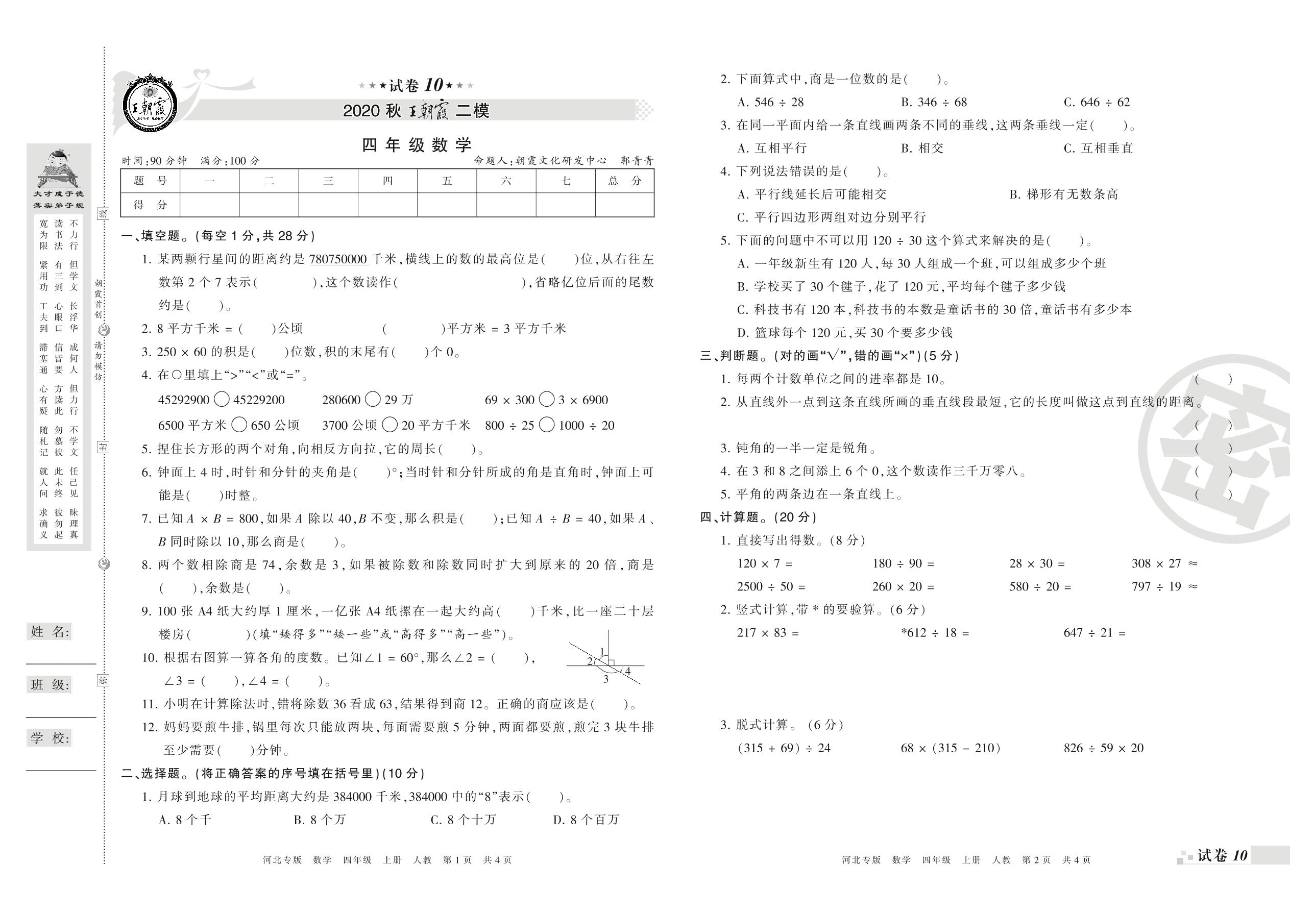 王朝霞期末模拟卷四年级上册数学(人教版)_R210804140716【10】