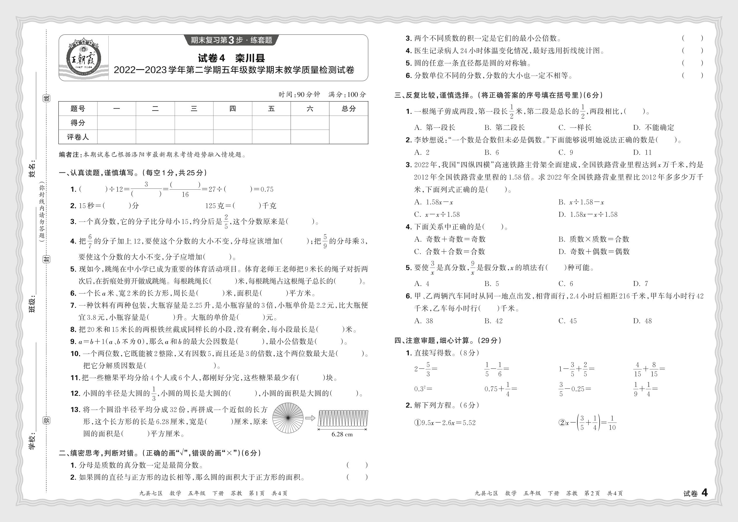河南省洛阳市栾川县2022—2023学年第二学期五年级数学期末教学质量检测试卷(苏教版)【4】