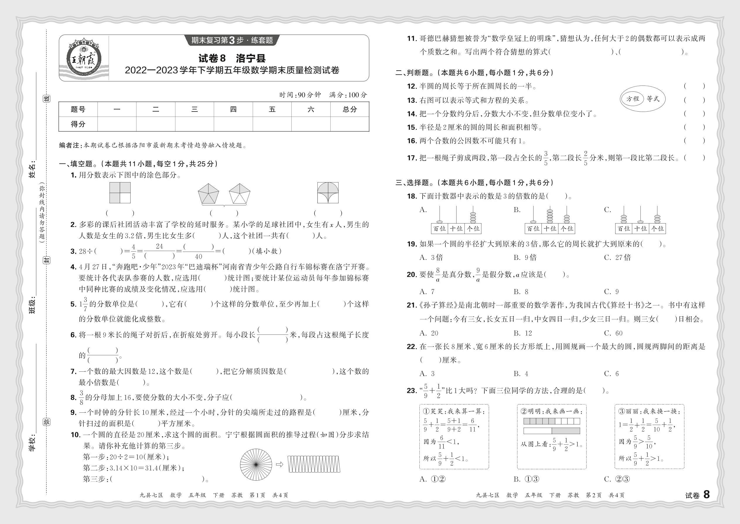河南省洛阳市洛宁县2022—2023学年下学期五年级数学期末质量检测试卷(苏教版)【8】