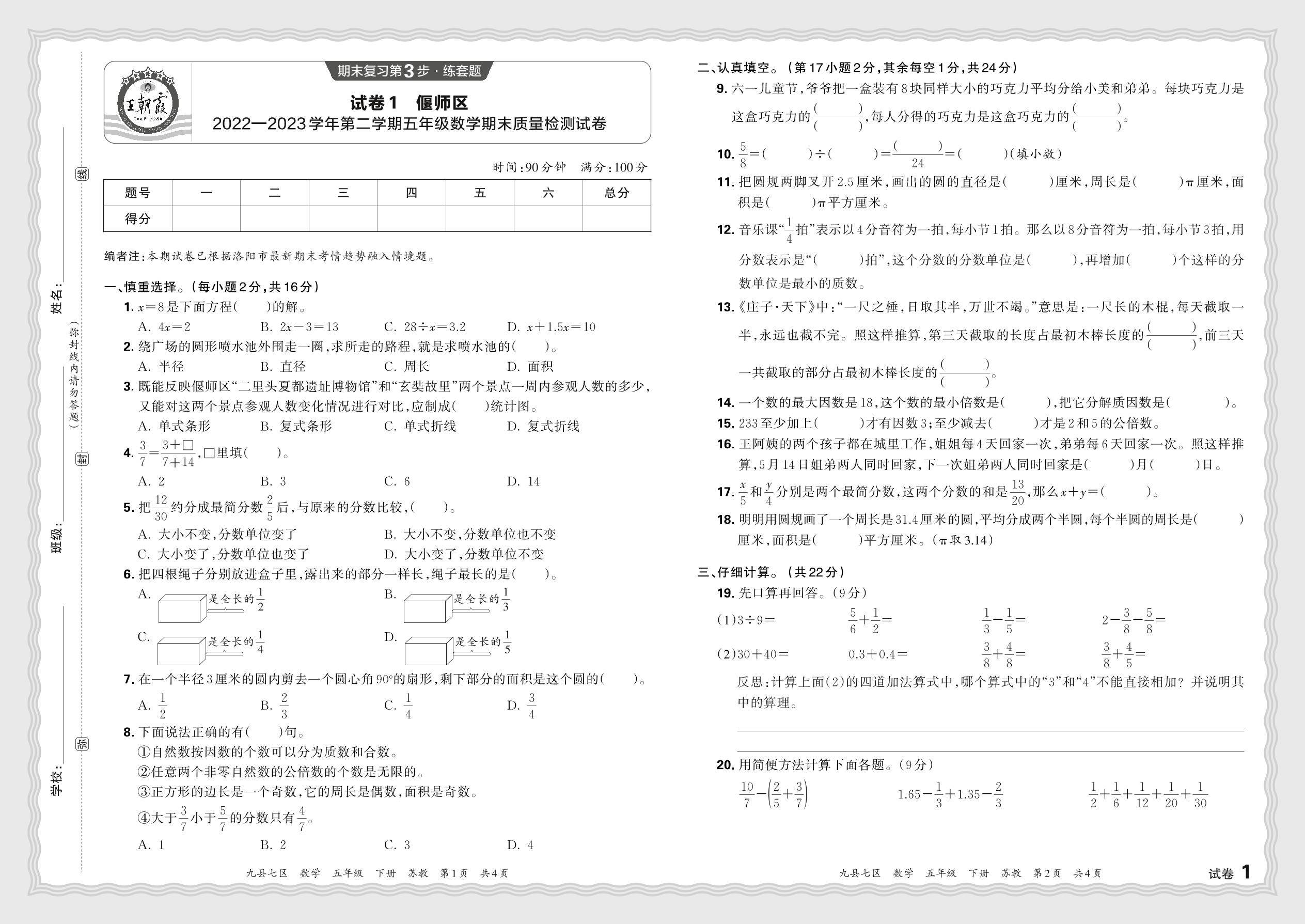 河南省洛阳市偃师区2022—2023学年第二学期五年级数学期末质量检测试卷(苏教版)【1】