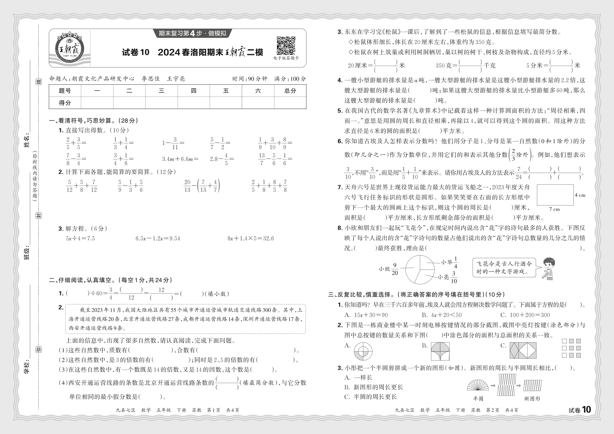 2024春下册五年级数学苏教版 河南洛阳期末王朝霞二模