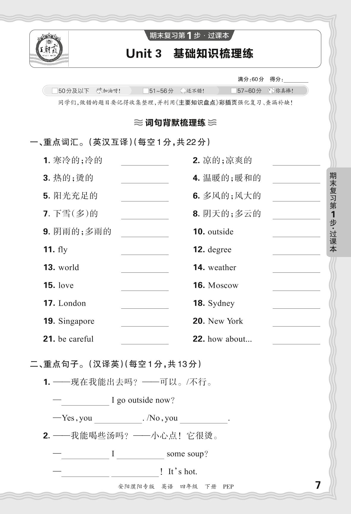 2024春下册四年级英语人教PEP版 期末过课本安阳濮阳版·Unit 3 基础知识梳理练