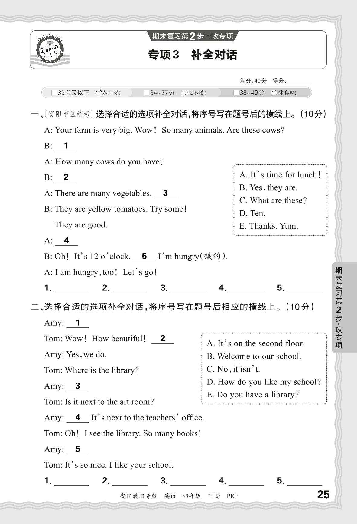 2024春下册四年级英语人教PEP版 期末专项卷安阳濮阳版·补全对话【3】