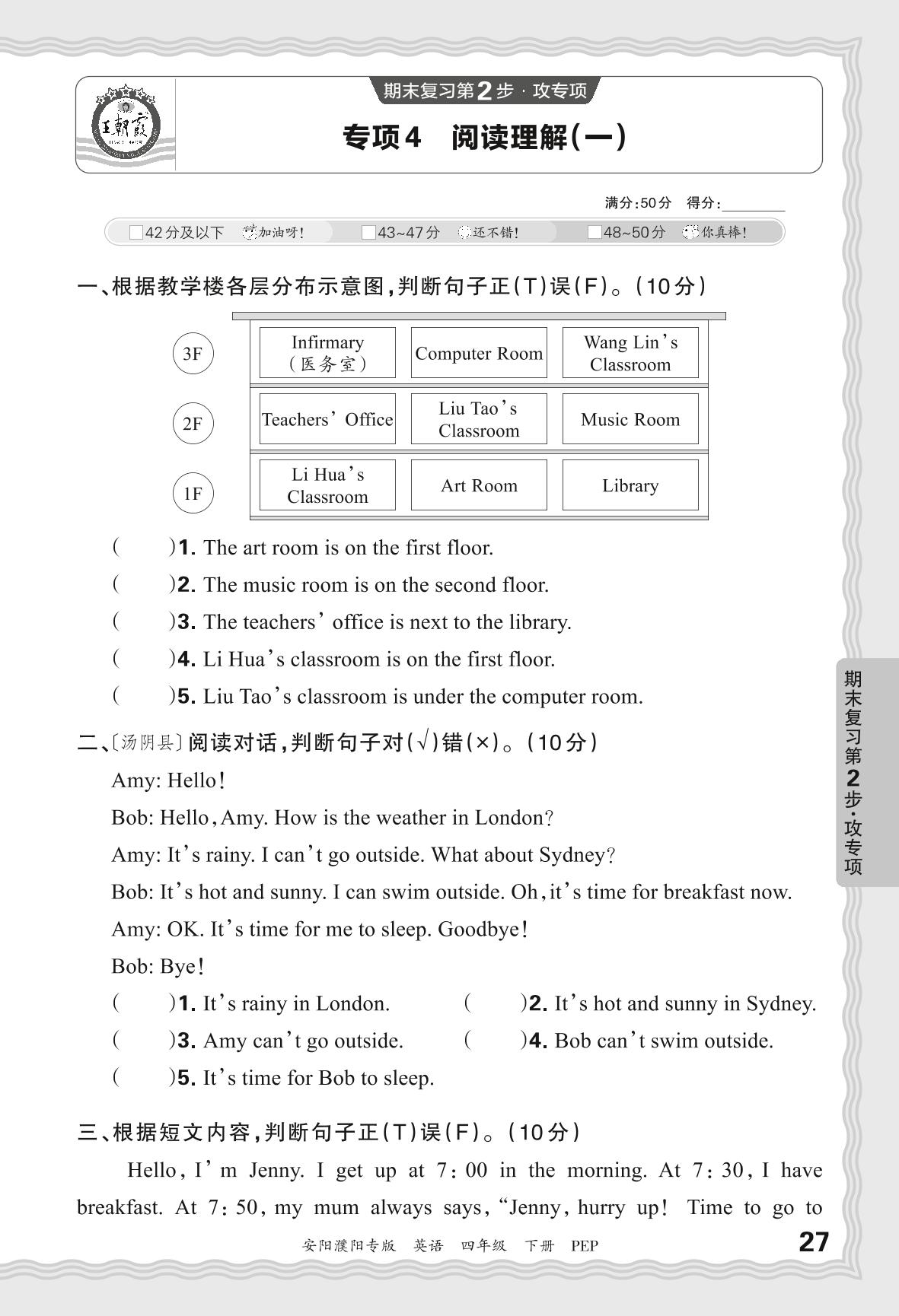 2024春下册四年级英语人教PEP版 期末专项卷安阳濮阳版·阅读理解(一)【4】