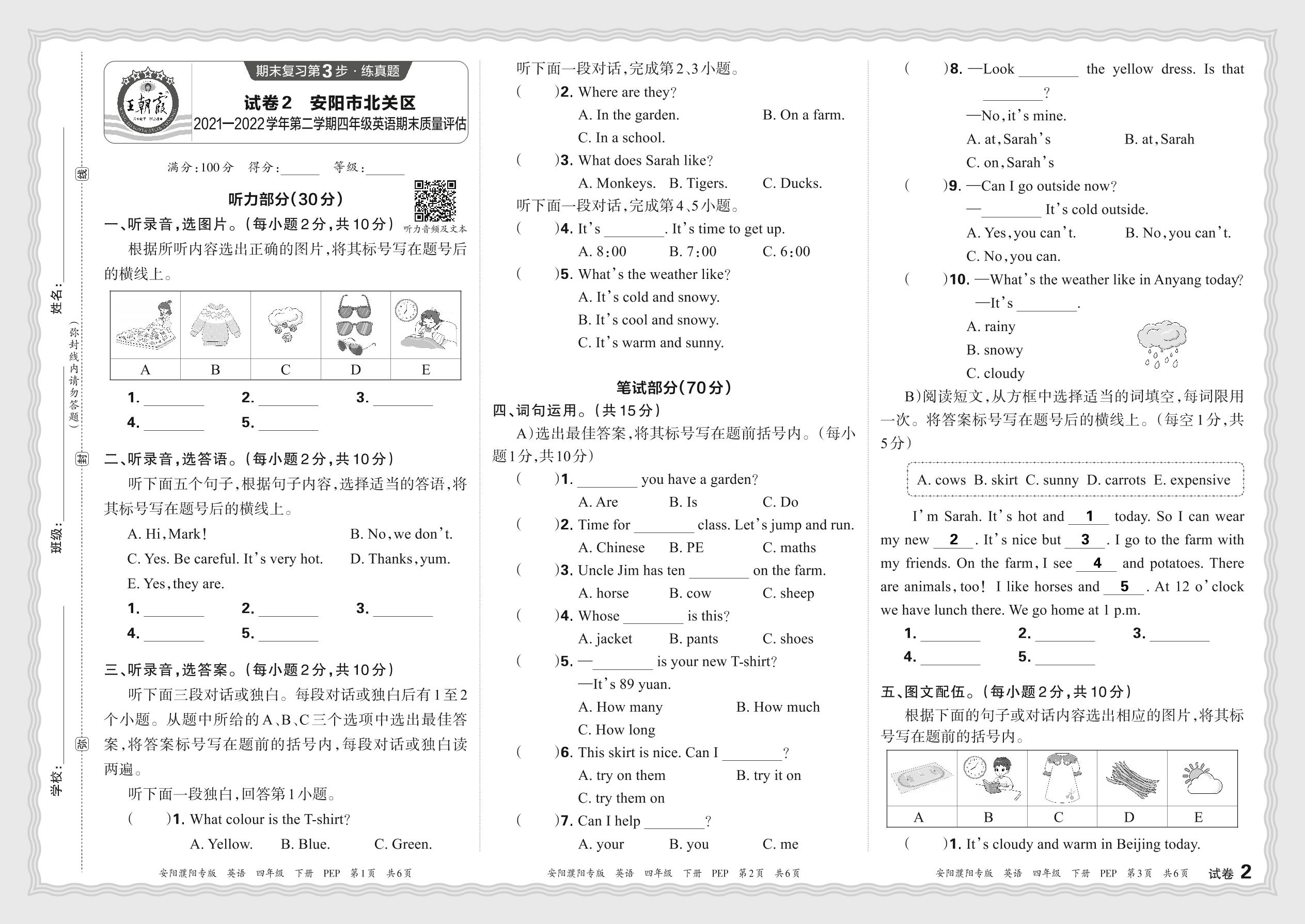 河南省安阳市北关区2021-2022学年第二学期四年级英语期末质量评估(人教PEP版)【2】