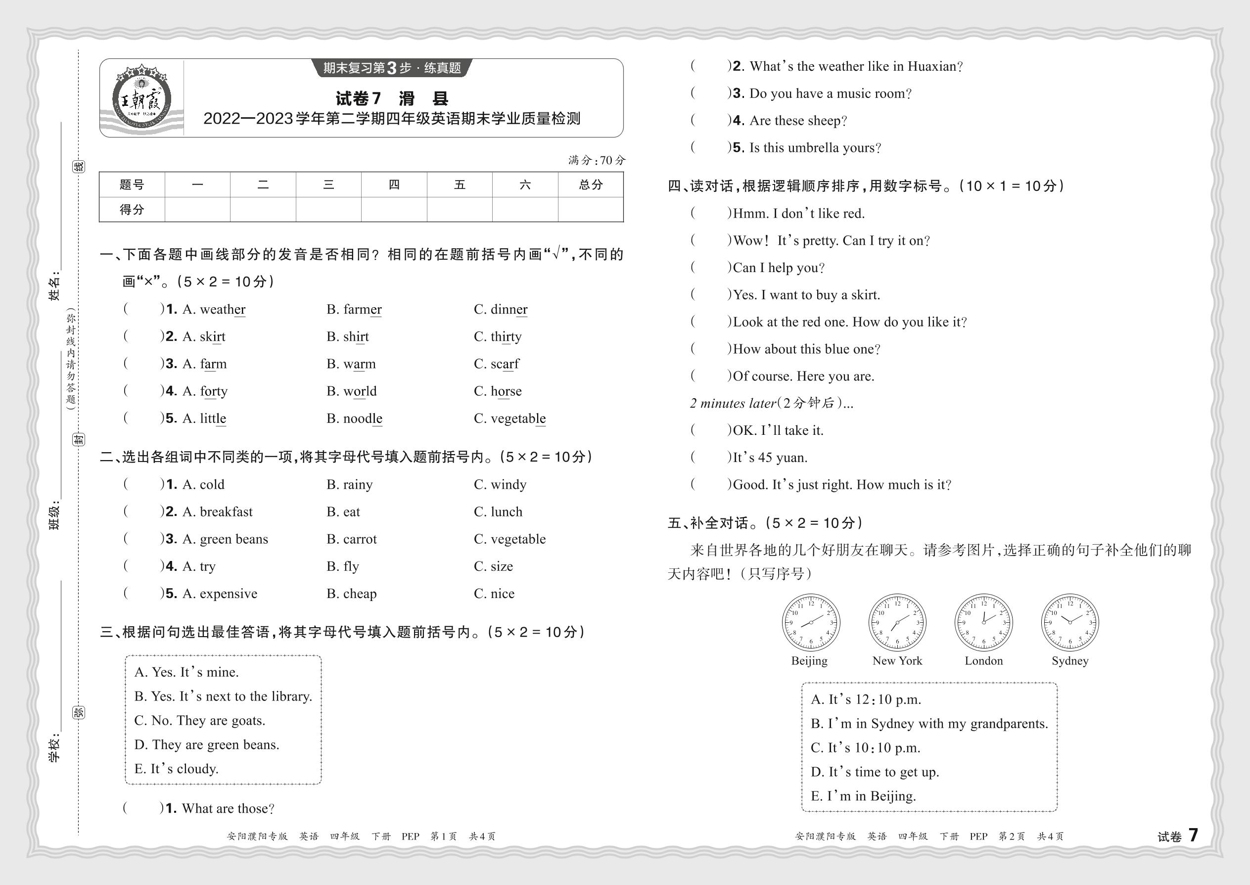 四年级英语人教PEP版(三起始)下册期末卷