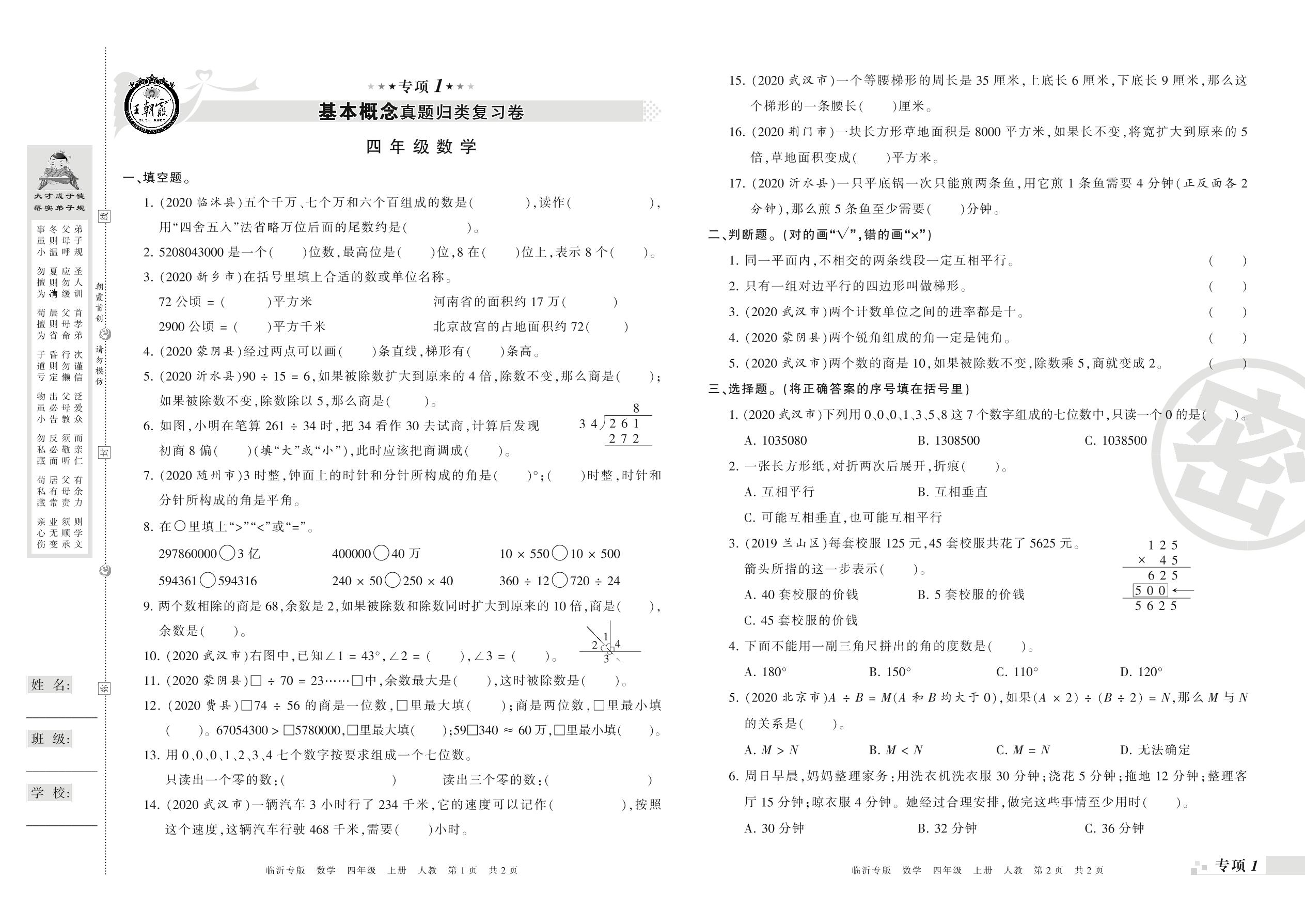 王朝霞期末专项卷——基本概念、计算真题归类复习四年级上册数学(人教版)【0】