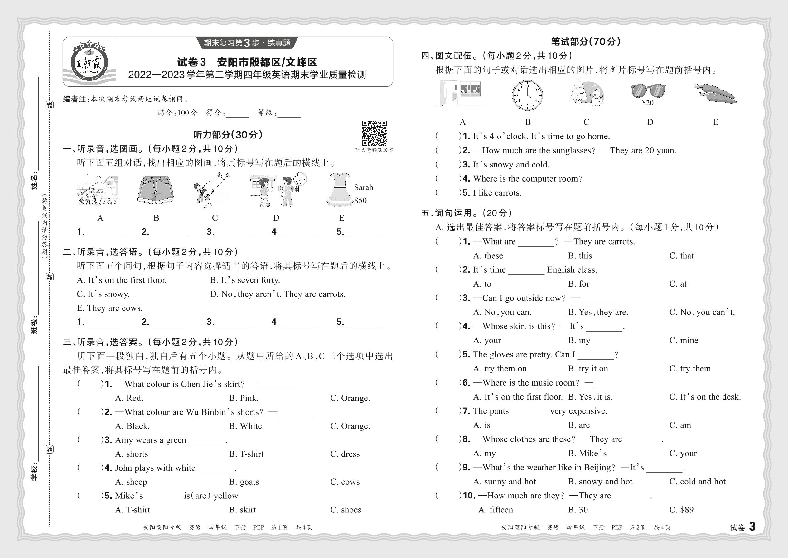河南省安阳市殷都区、文峰区2022-2023学年第二学期四年级英语期末学业质量检测(人教PEP版)【3】