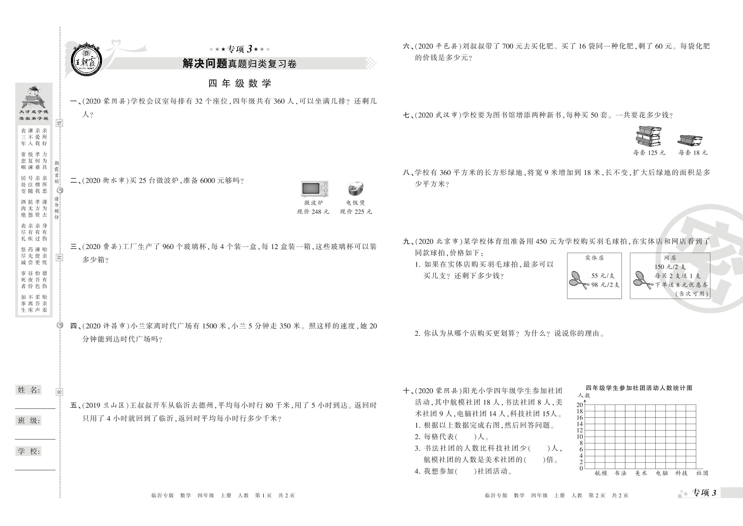 王朝霞期末专项卷——解决问题真题归类复习、新颖题速递:生活与数学四年级上册数学(人教版)【0】