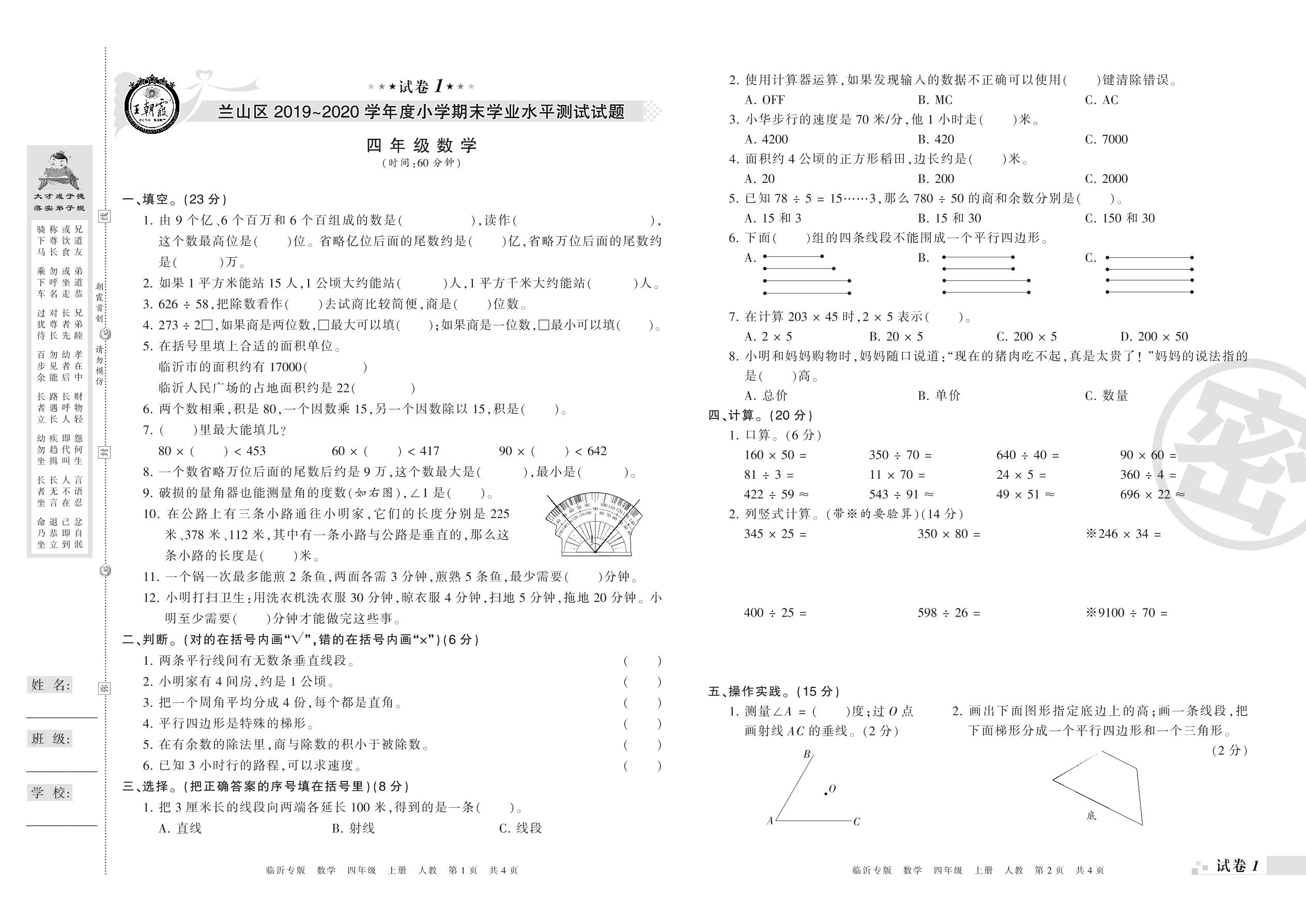 2019-2020学年第一学期临沂市兰山区四年级数学试卷(人教版)【1】