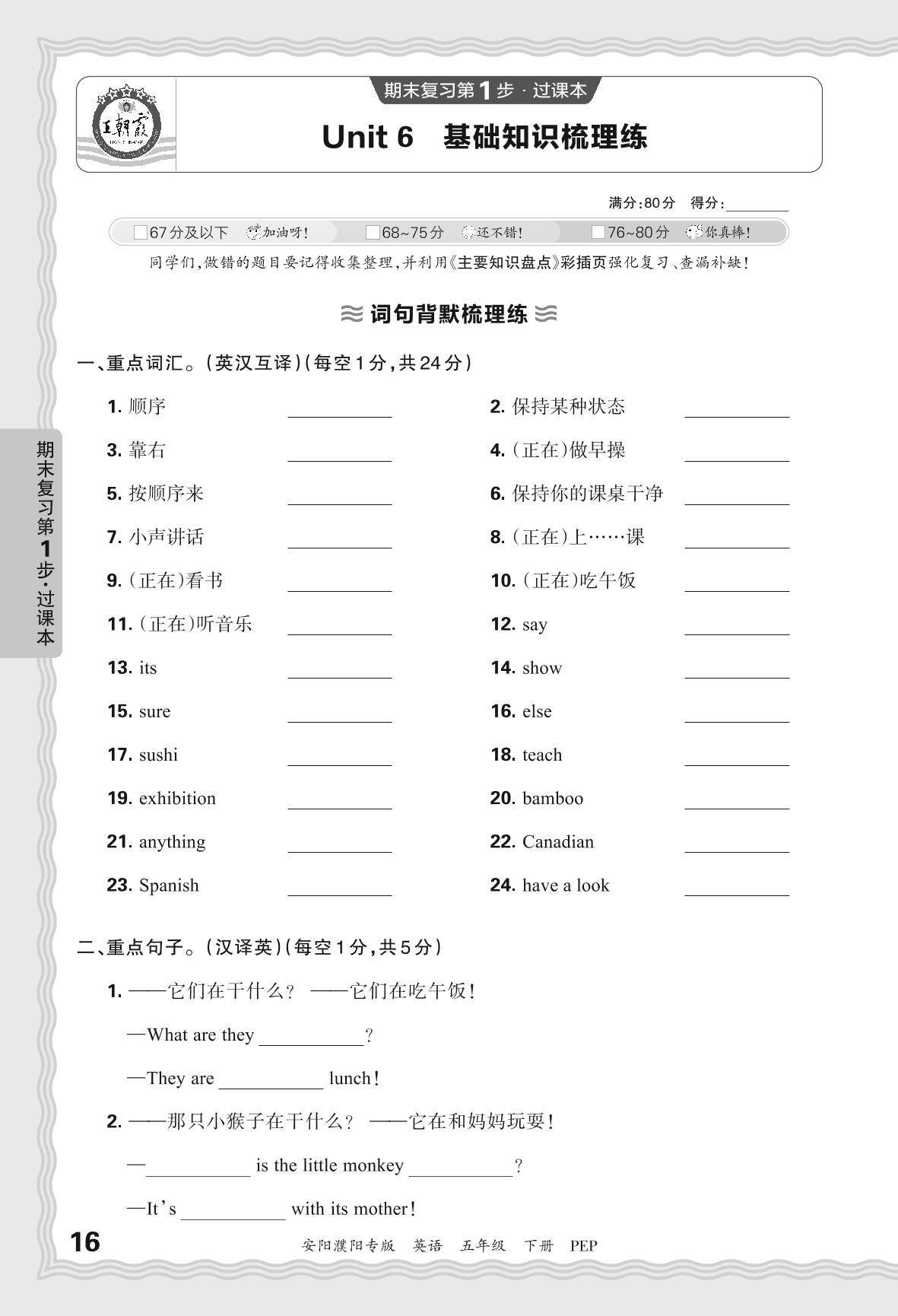 2024春下册五年级英语人教PEP版 期末过课本安阳濮阳版·Unit 6 基础知识梳理练