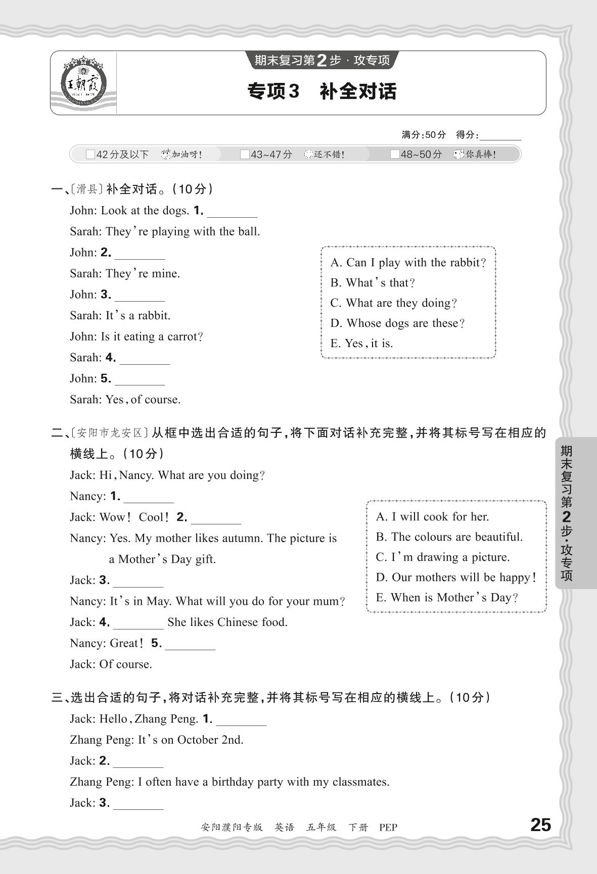 2024春下册五年级英语人教PEP版 期末专项卷安阳濮阳版·补全对话【3】