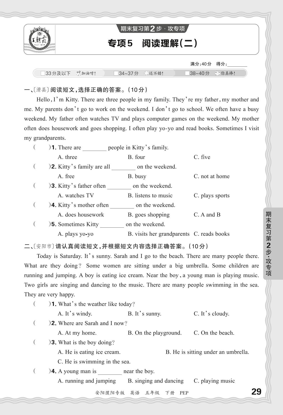 2024春下册五年级英语人教PEP版 期末专项卷安阳濮阳版·阅读理解(二)【5】