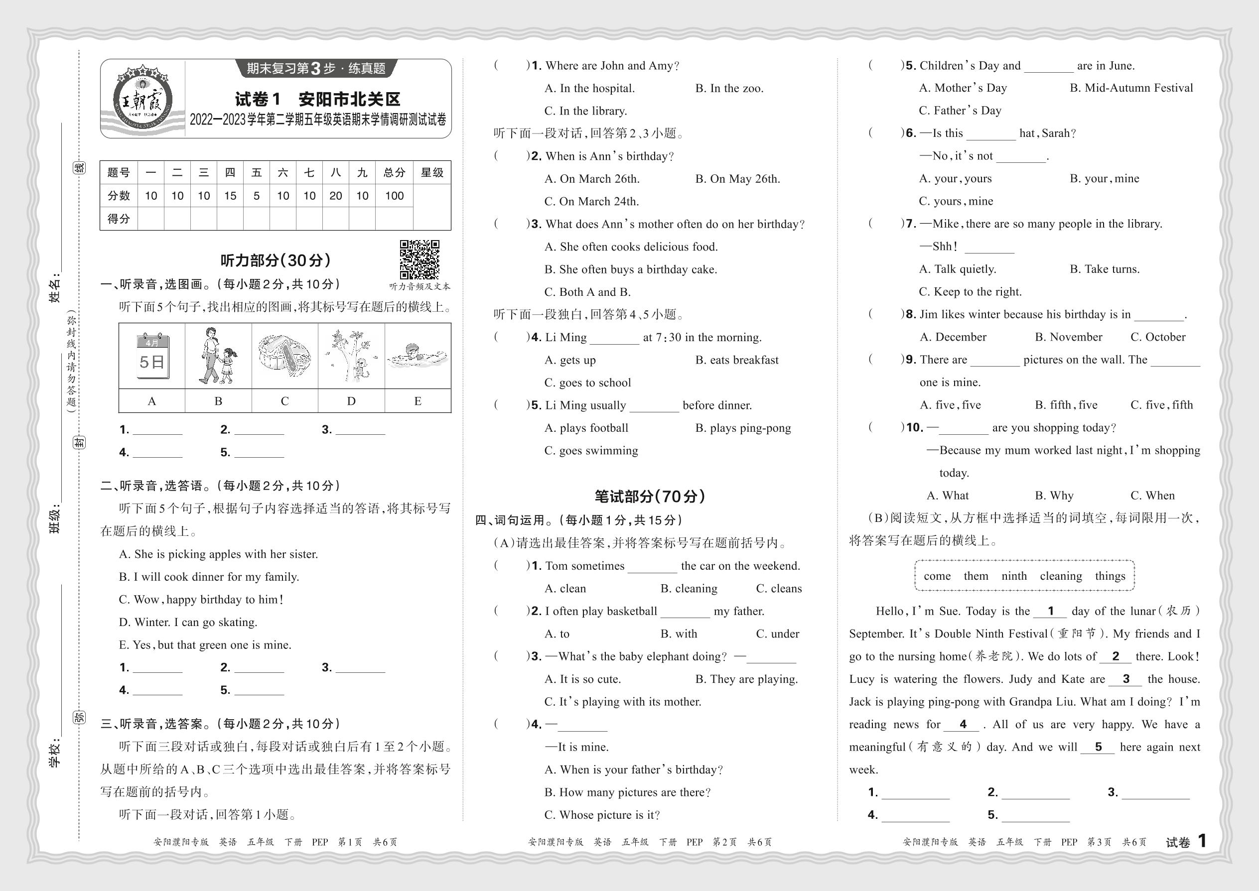 河南省安阳市北关区2022-2023学年第二学期五年级英语期末学情调研测试试卷(人教PEP版)【1】