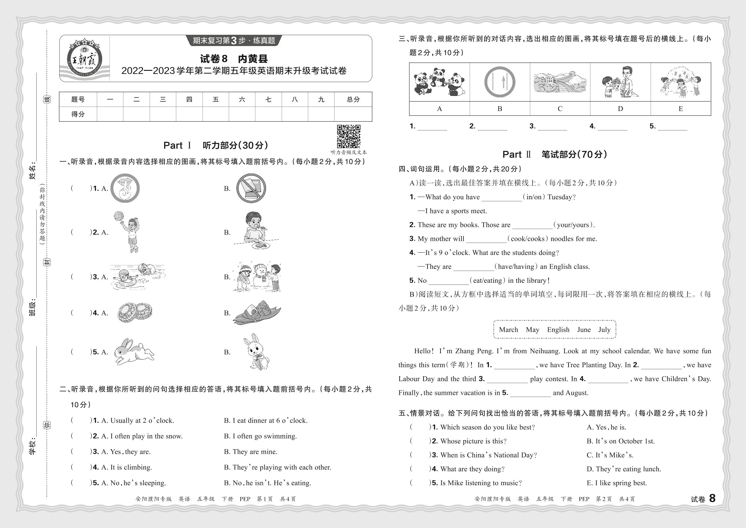 河南省安阳市内黄县2022-2023学年第二学期五年级英语期末升级考试试卷(人教PEP版)【8】